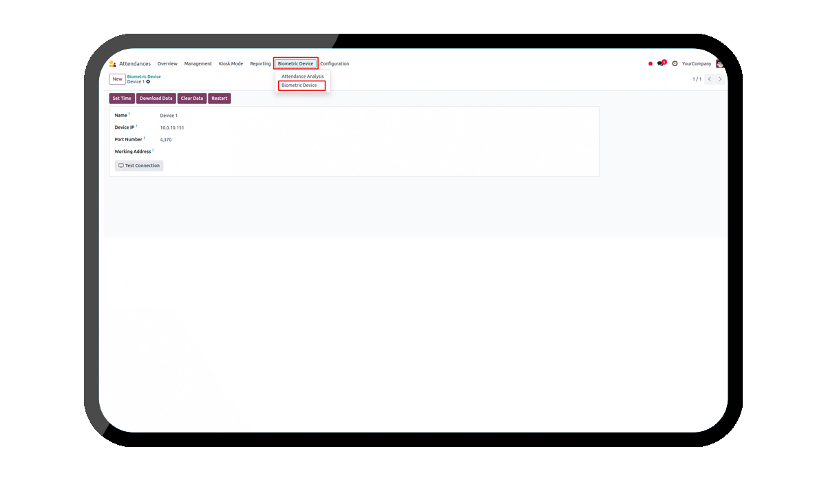 Go to the Biometric Device menu, enter the device’s IP address and port, then test the connection.