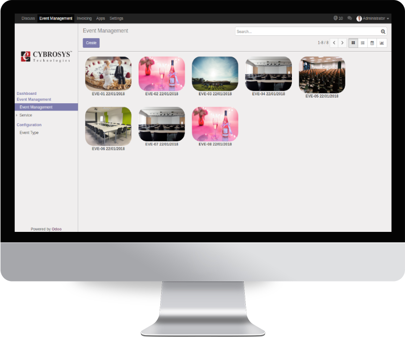 Event management is a core module which can manage any type of events. The user can selectively download and install different service modules to extend the scope of this module. The new service will be automatically get attached to this core Event management module. It is different from Odoo's event module. Here you can manage different types of events and allocate services to different users.