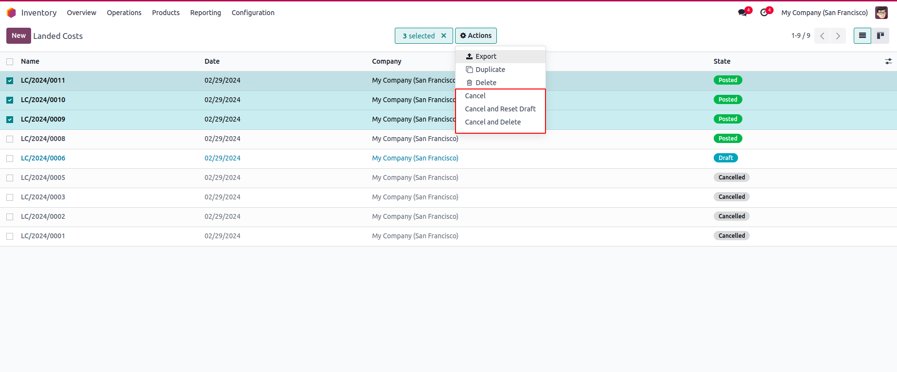 We Can Cancel Multiple Landed Costs From The Tree View.