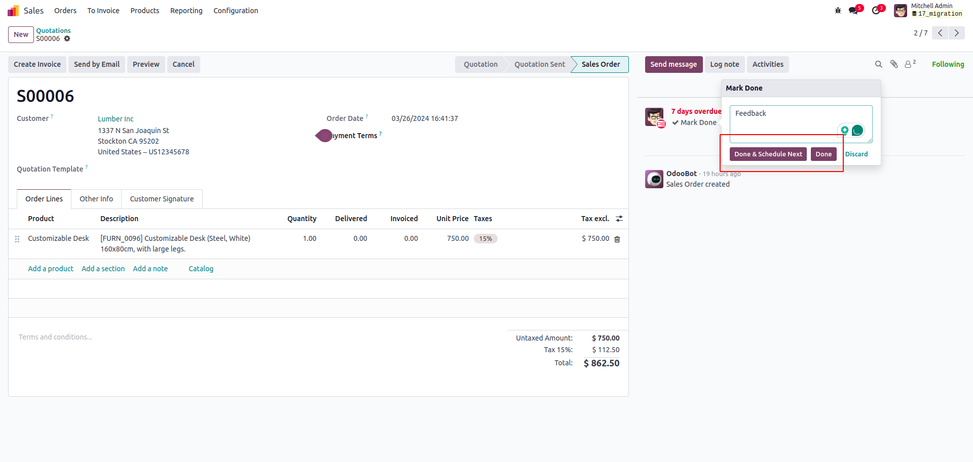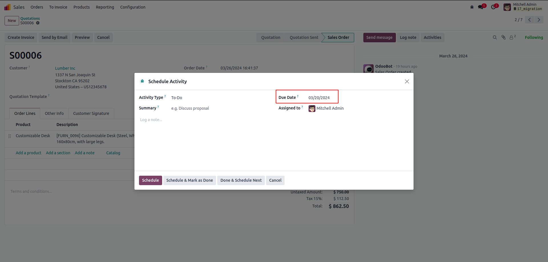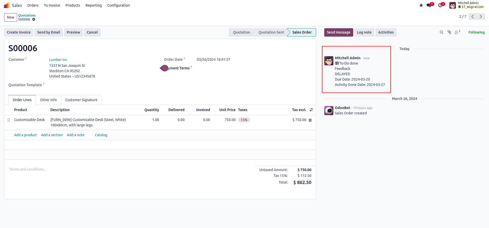 The scheduled date and completion date of an activity are both showcased in the chatter feed.