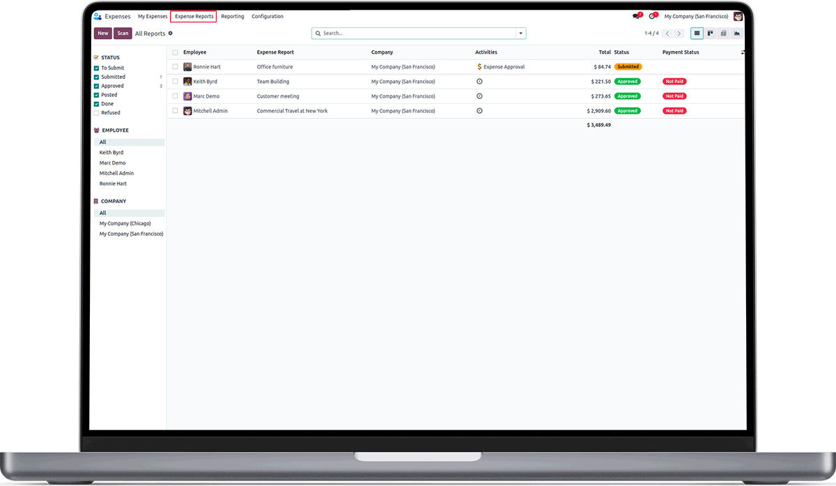 Select the expense reports in the posted state to register the payment and click on "Register Payment" Button inside the action.
