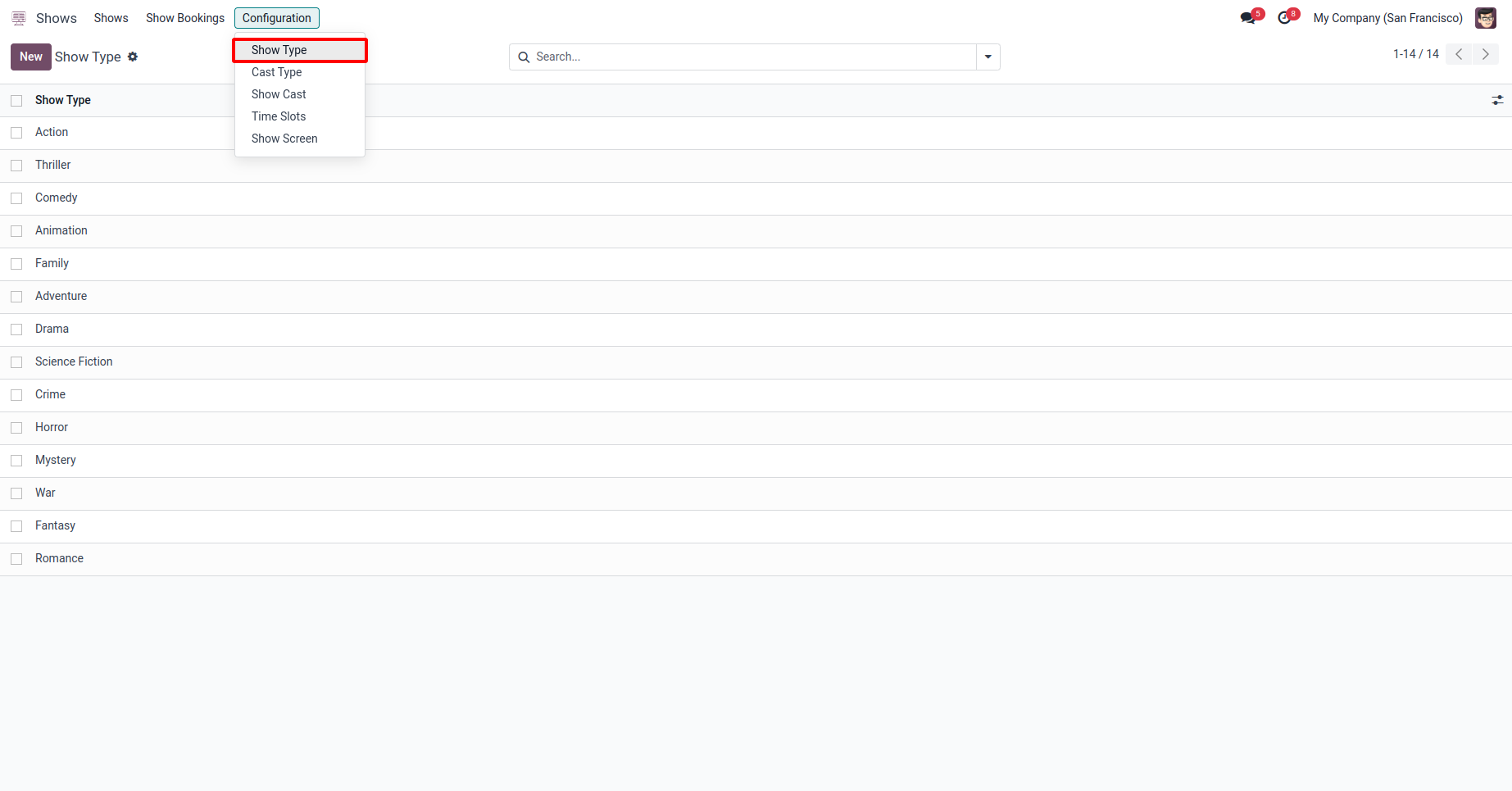 Create shows by specifying the following required fields: name, release date, show type, language, time slots, screen, show start date, show end date, show poster, and price. Upon creation, clicking the button 'Start Show' will change the state of the show to ongoing.