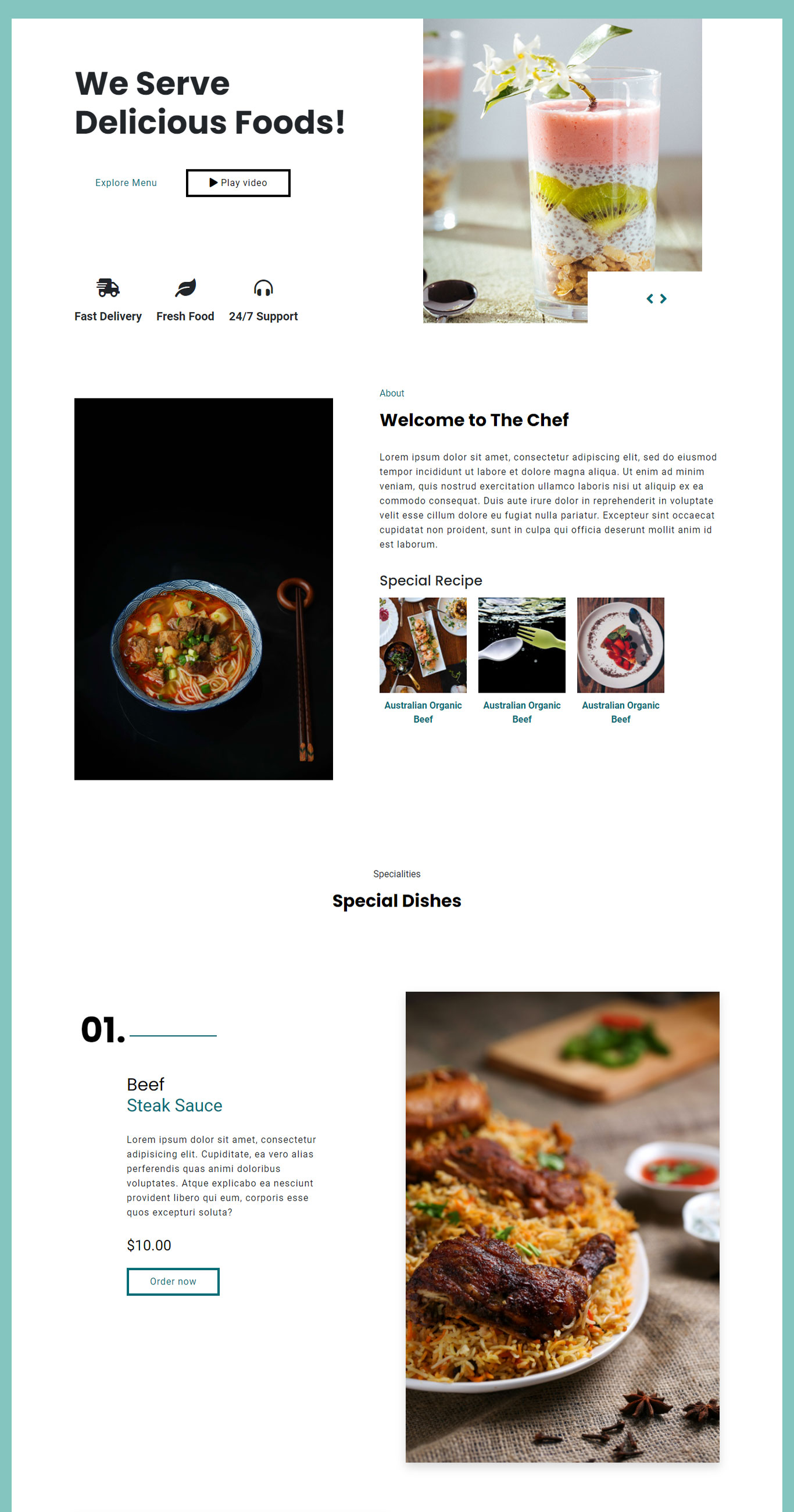 Theme The Chef is a popular attractive and unique front end theme for your restaurant website. Many custom designed snippets facilitates to add better user experience. Just drag & drop the building blocks you need to easily build your layout. All layouts are made of sections, that you can easily combine to fit your specific project.It has simple and more attractive snippets.