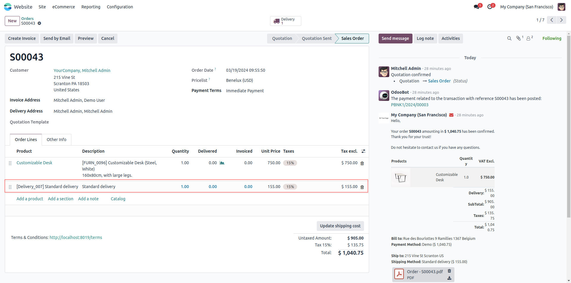The selected shipping method is updated in the corresponding sale order.