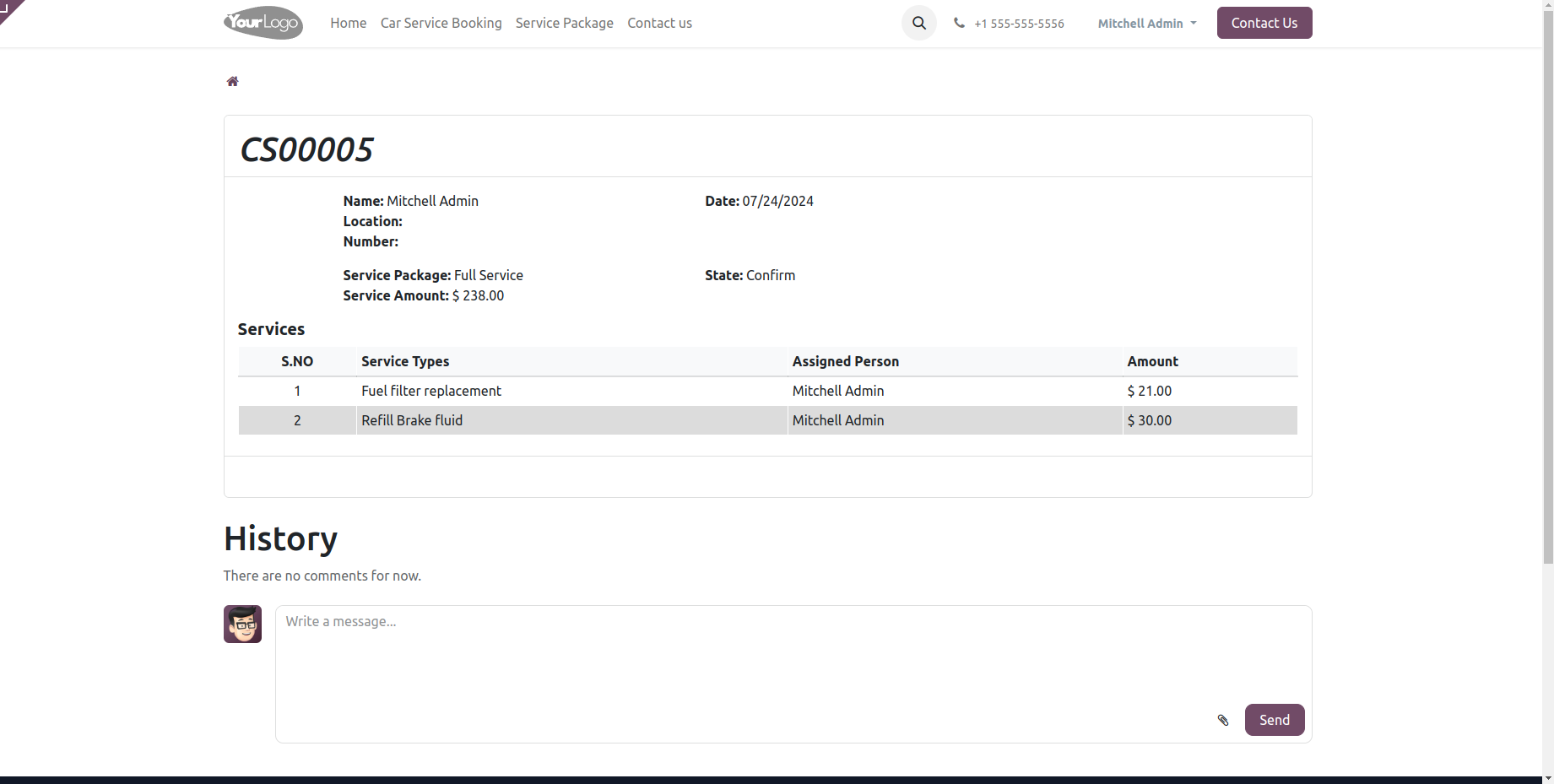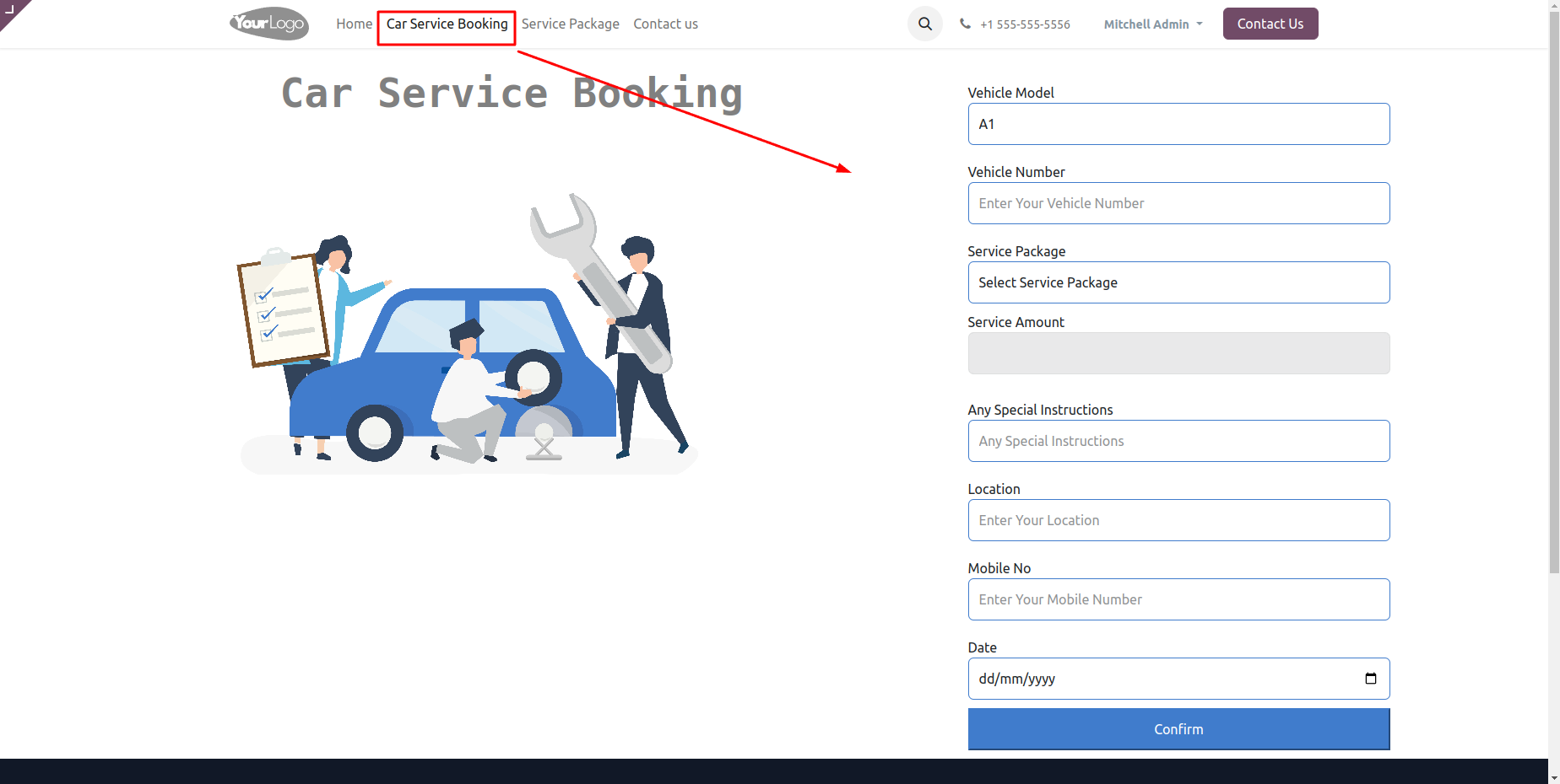 Add the Customer name, the Vehicle model and service package, then automatically update the amount. Set the date, car number, current location and mobile number.Then click Confirm button.