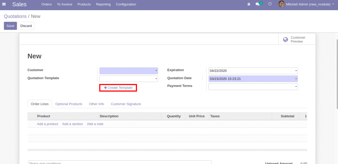 • check'Create Template' button to quick create the quotation template.