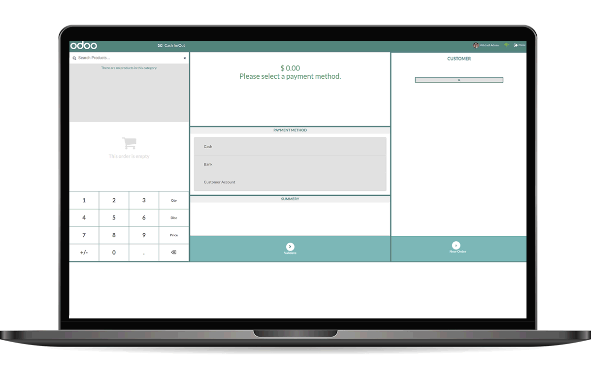 When a product is clicked, it is added to the order lines and the total is displayed beneath it. We can adjust the amount, price, and discount using the number pad.