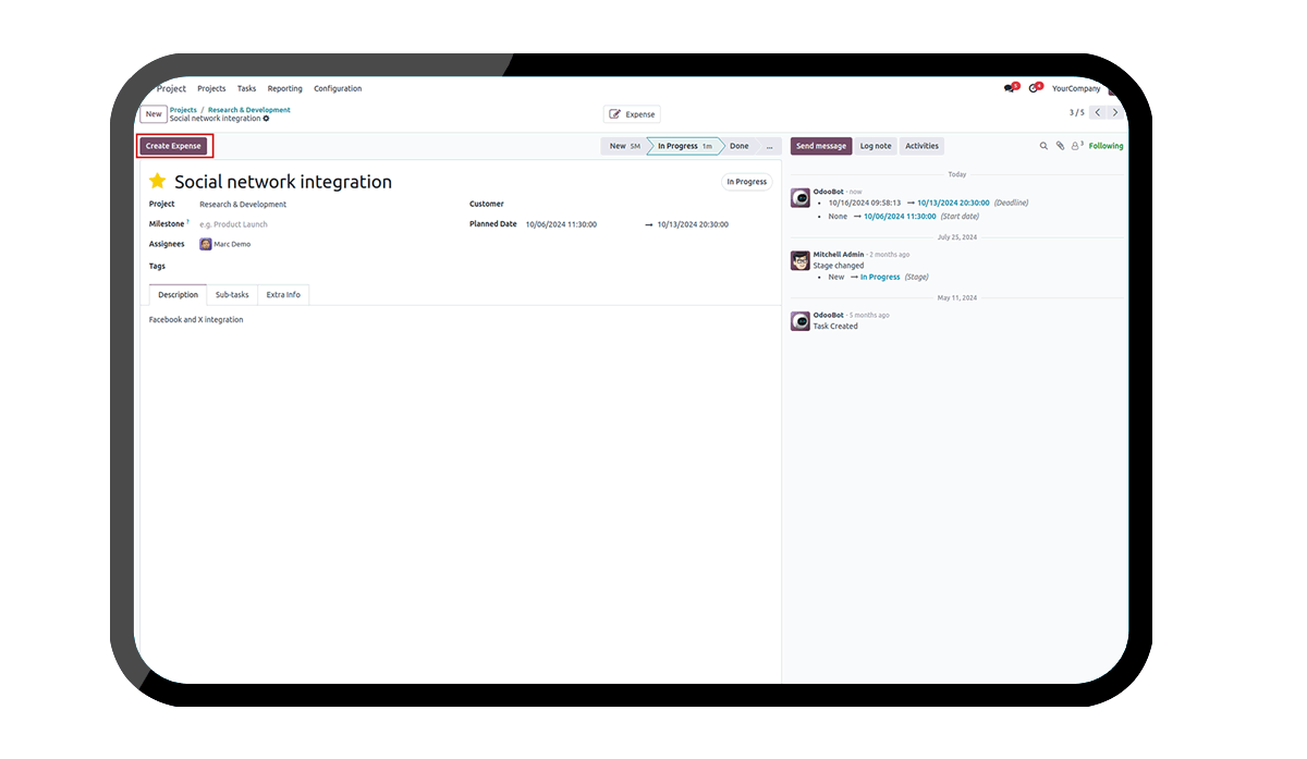 The Create Expense button could allow users to create multiple expenses for a single project task, which is useful for tasks that require multiple purchases or expenditures.