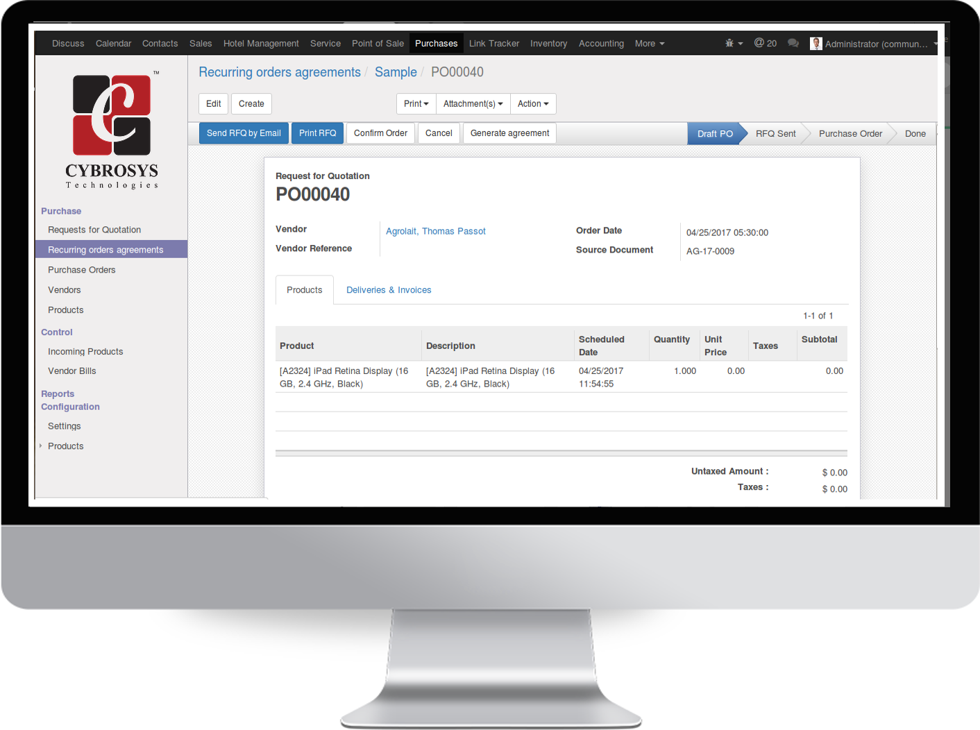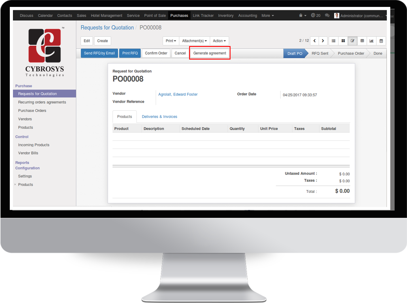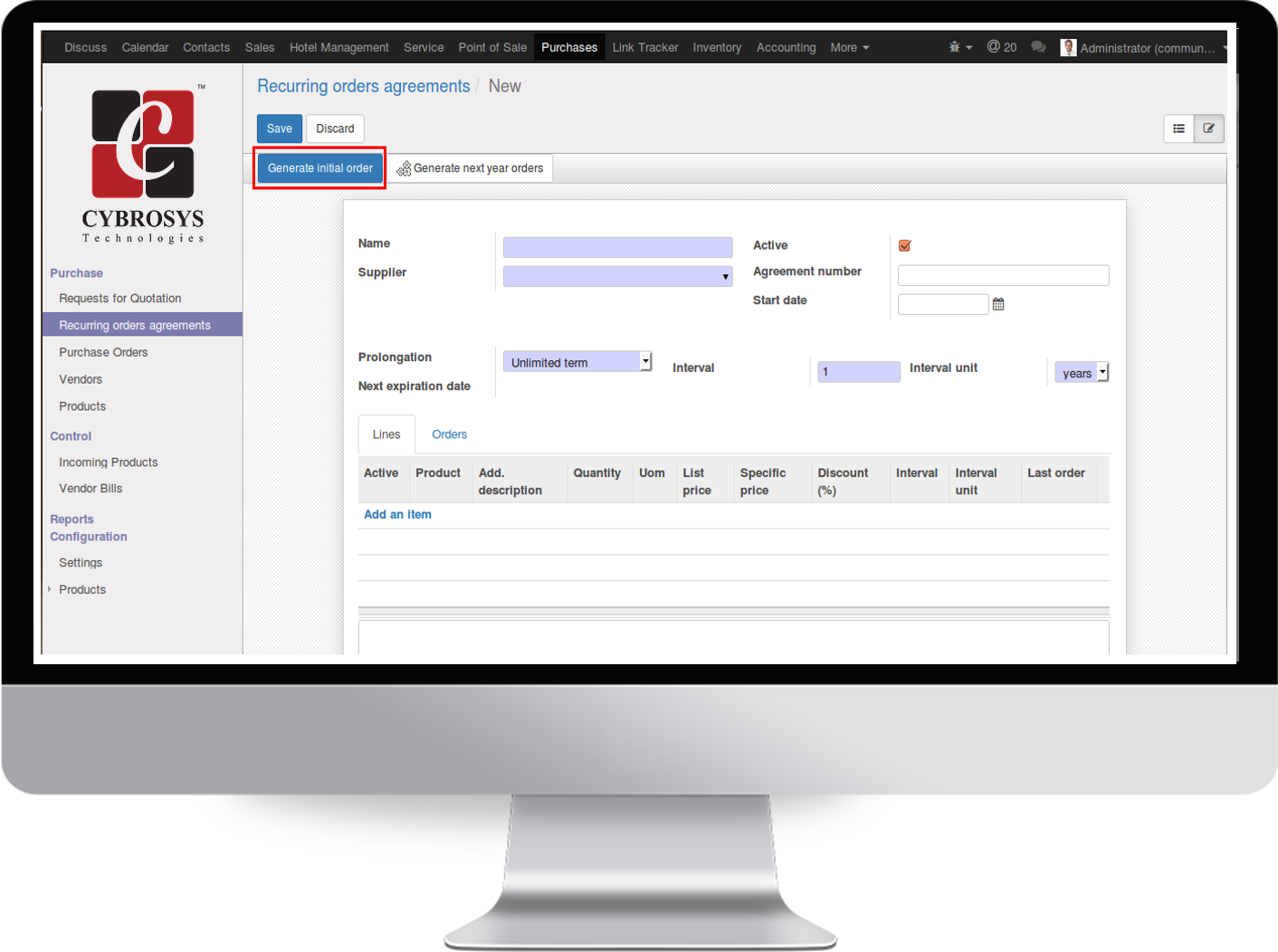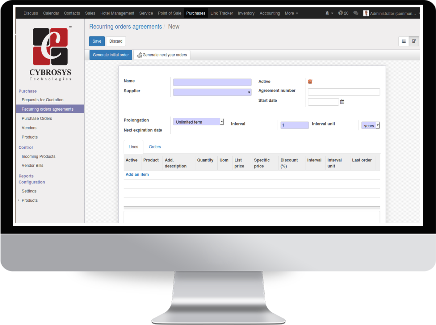Here you can fill all the information related to Recurring order agreements. Once saved, you can generate initial purchase order.