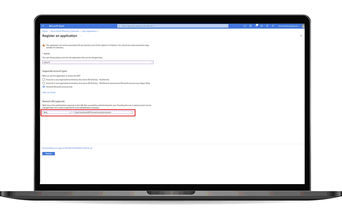 Create Onedrive api register application on Microsoft Azure Portal. Give the Redirect URI as base url with /onedrive/authentication. Eg: http://localhost:8015/onedrive/authentication