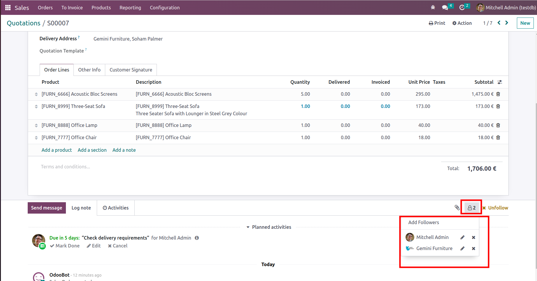 Action applied in the selected model. Select the order line in which you want to Add/Remove Multiple Followers, then go to Action and click on that Action.