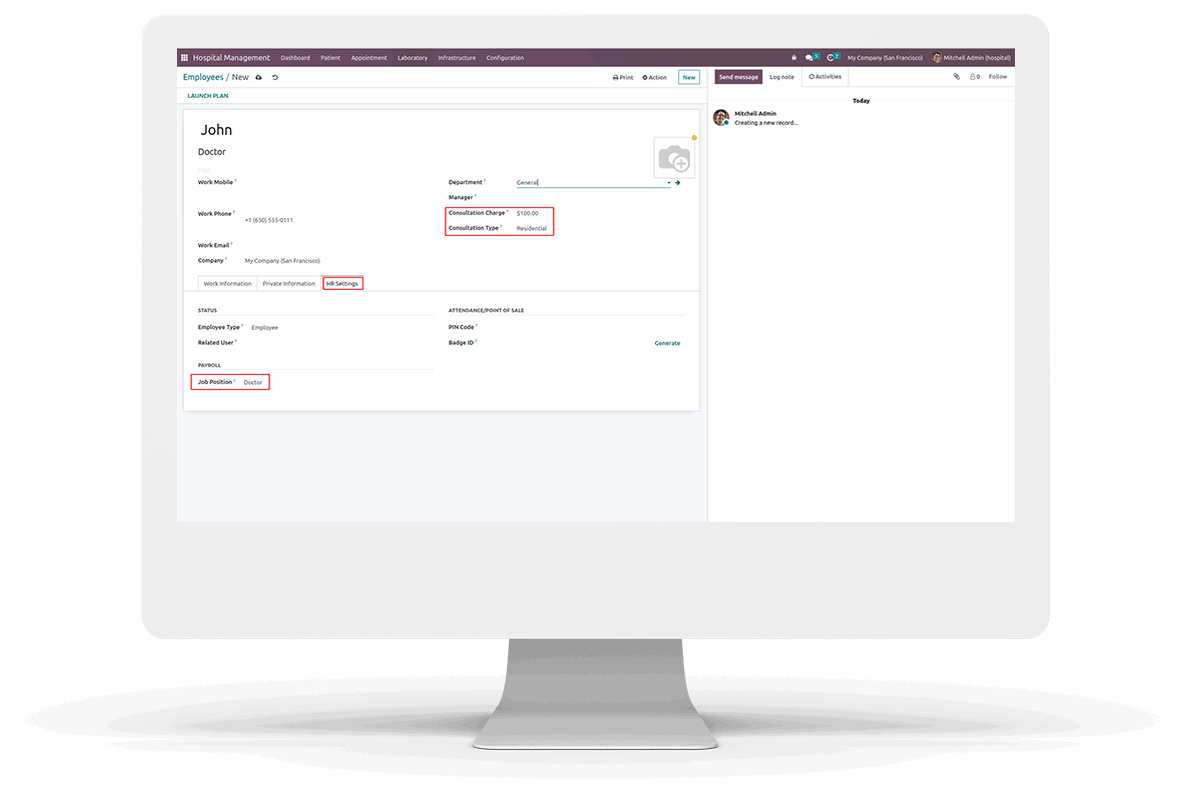 Navigate to Staff menu under Configuration. Add the Job Position. Also add Consultation Type, Average Time for a Patient and Consultation Charge for Doctors.