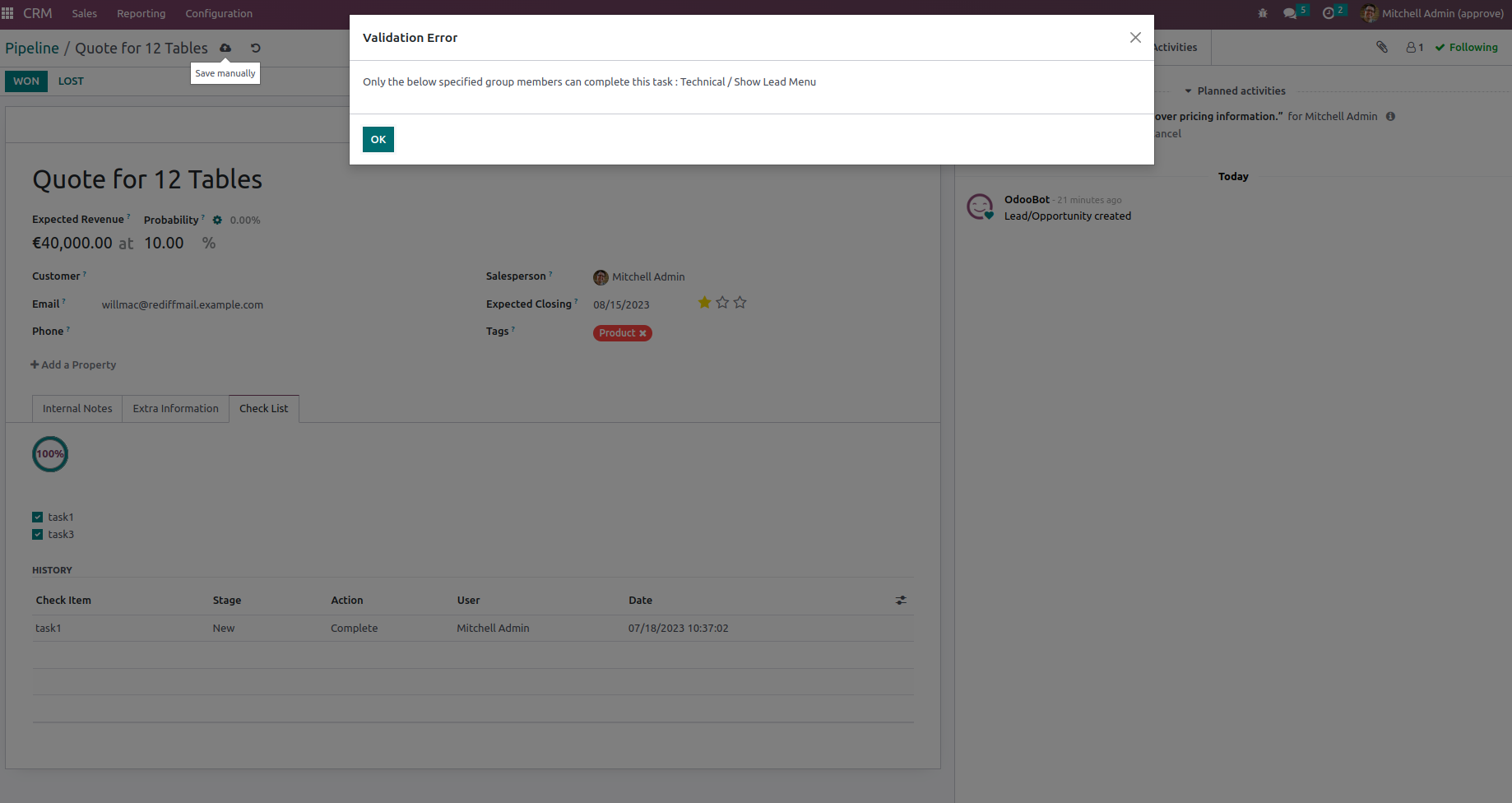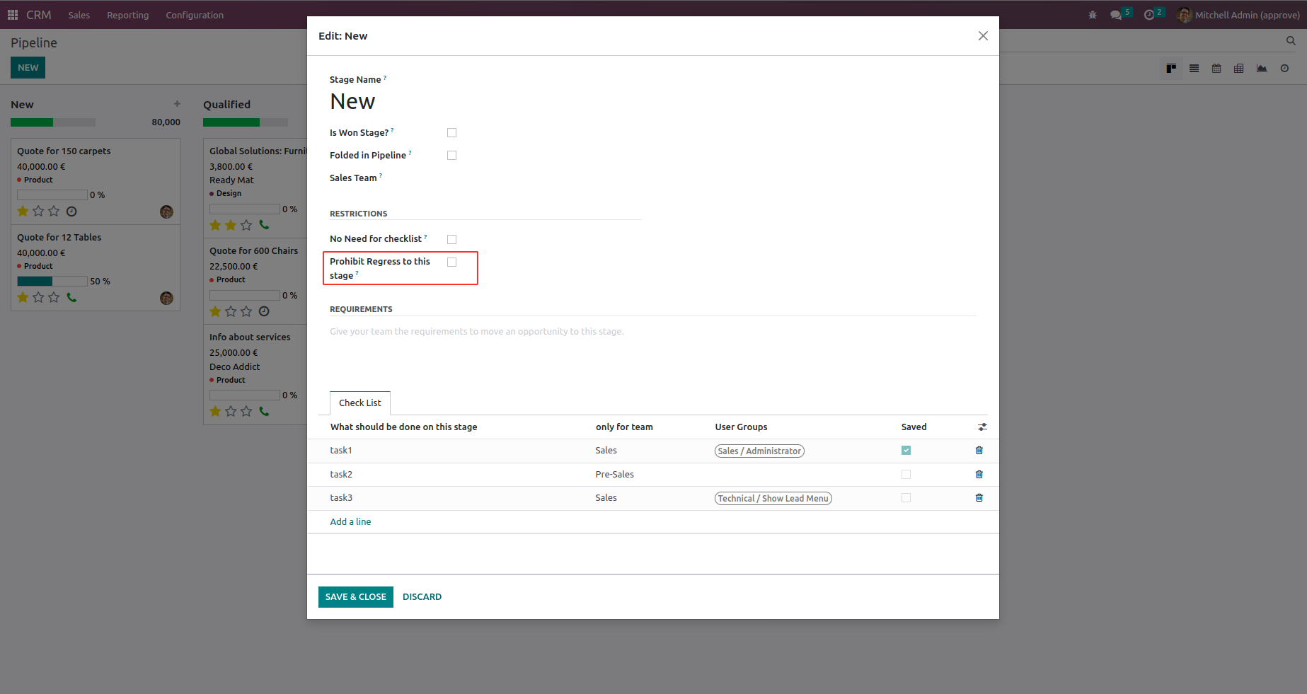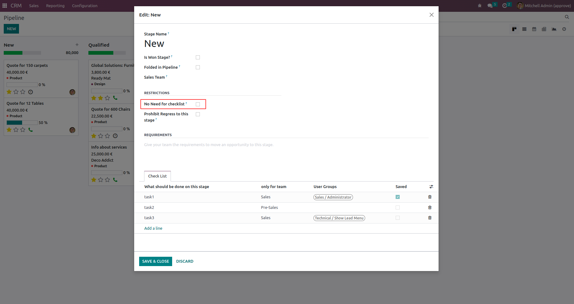 Making a customer from an opportunity is the goal of the CRM pipeline. To achieve that goal sales staff needs to undertake a specific sequence of actions or tasks. Each of those actions is important on the defined stage. For working as an efficient company The CRM is an important part. This app provides a checklist for each pipeline stage to control requirements, fulfillment and to make sure that each action/checklist item is fully approved by responsible users. So that it will be easier to manage through CRM pipelines.