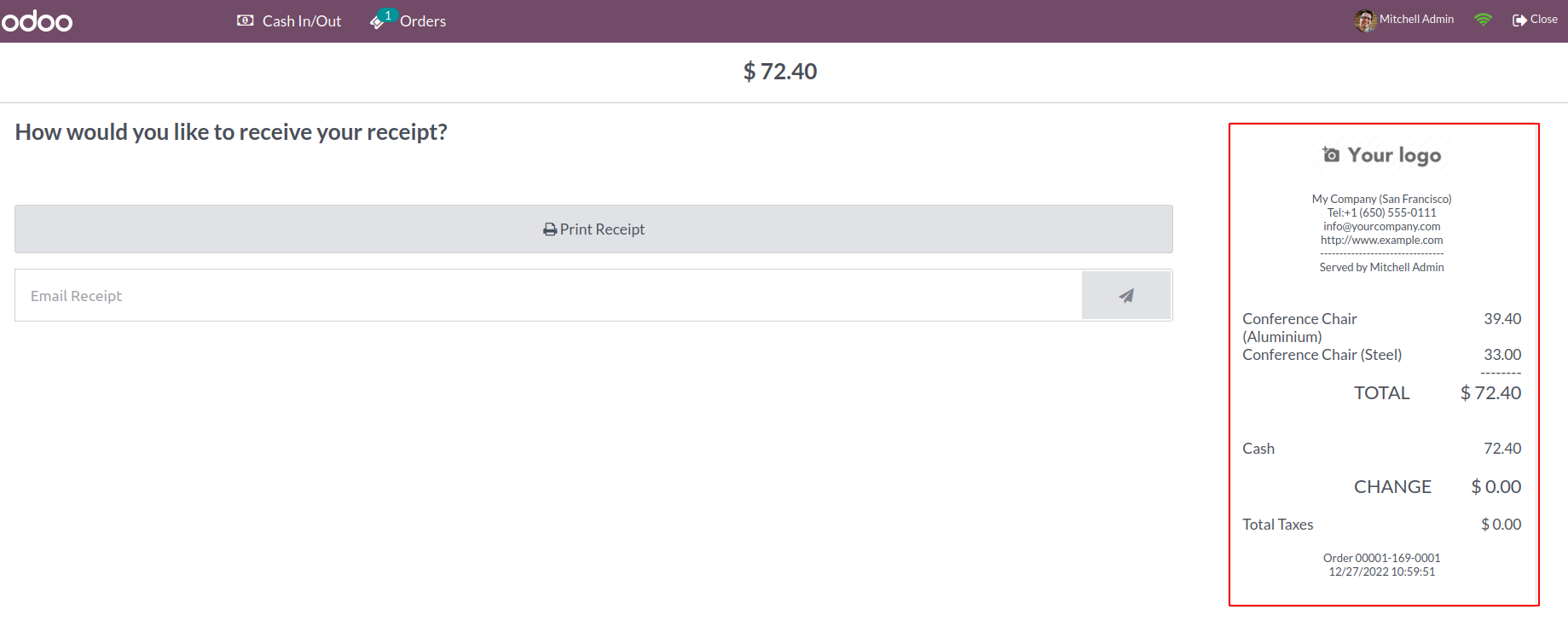 We can see the chosen receipts for the POS in the frontend of the POS, It will vary as per we're choosing from the Backend for each POS.