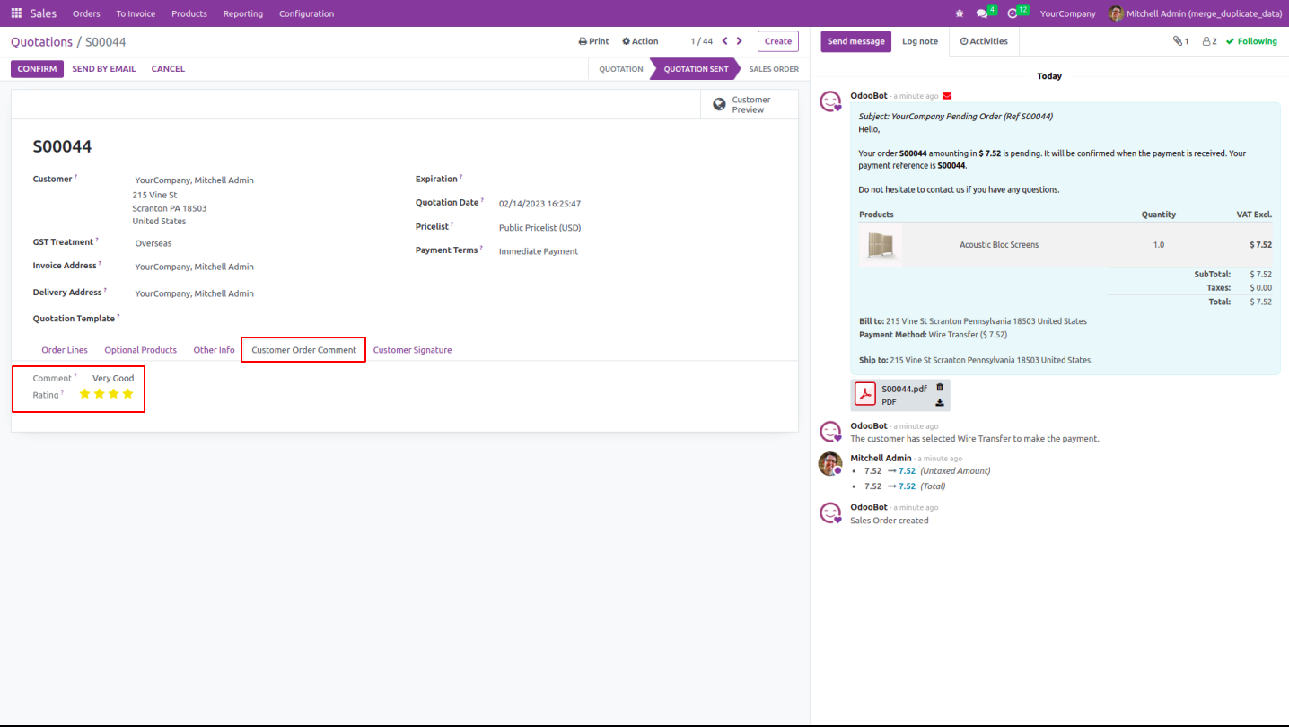 The comment and rating will get displayed in "Customer Order Comment" tab in the Form View of the corresponding Sale Order.