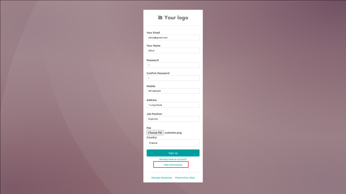 This odoo app is helpful if you need to customize the signup page with extra information.