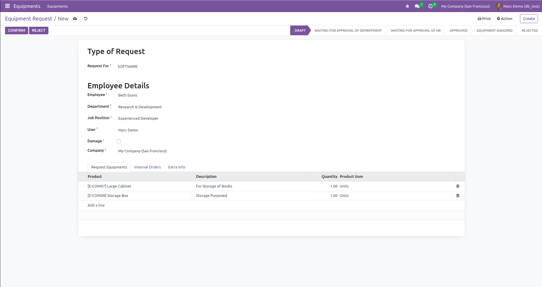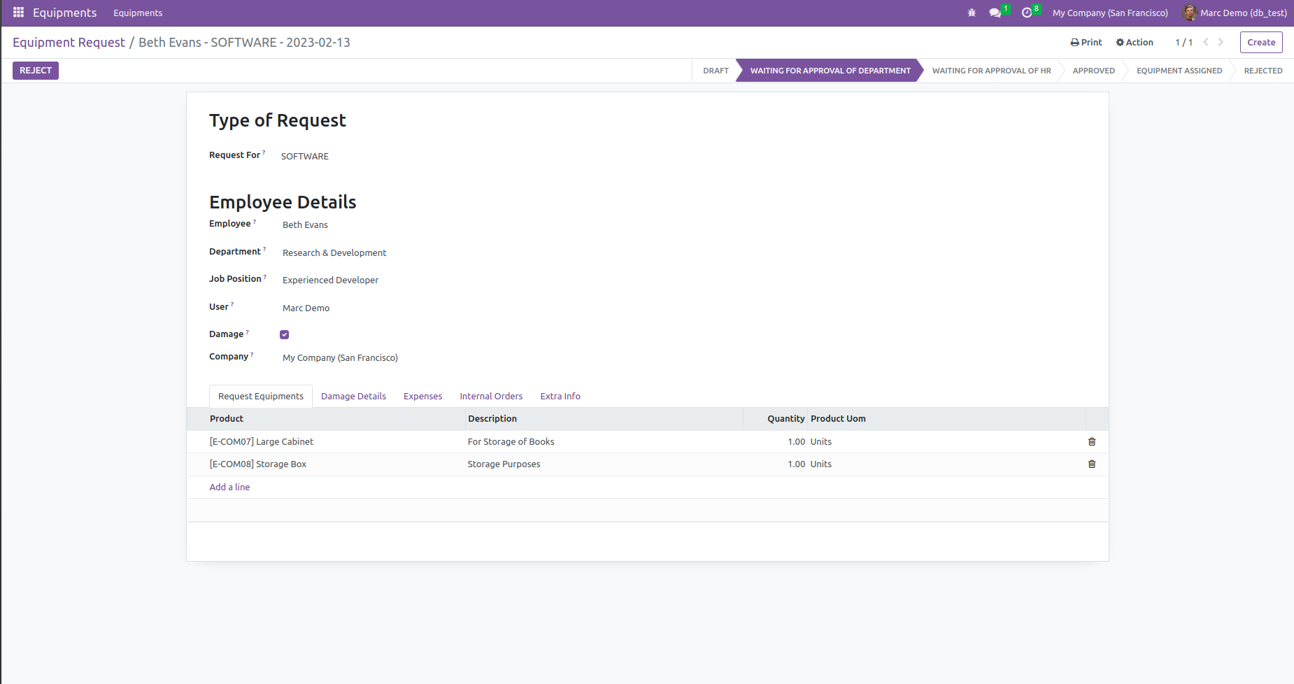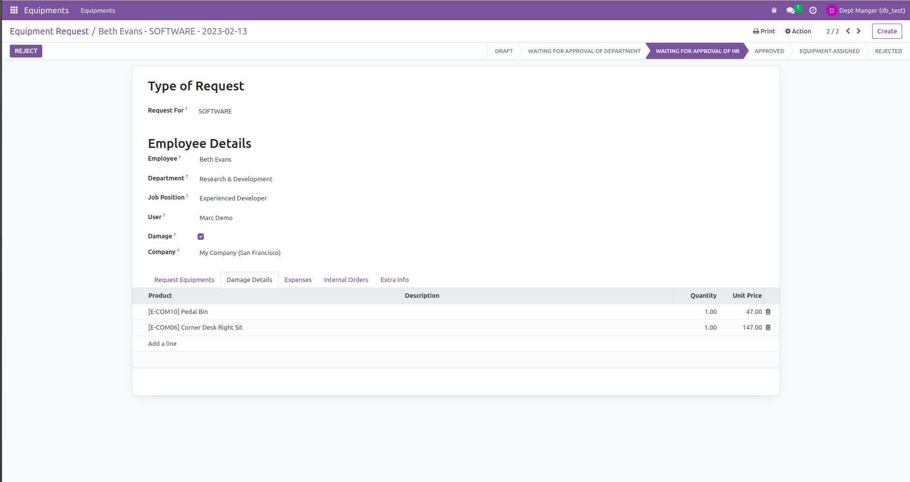 This module allows your employees to send requests to the Department Manager of Equipment for equipment type as equipment requests and equipment damage expense reimbursement requests.