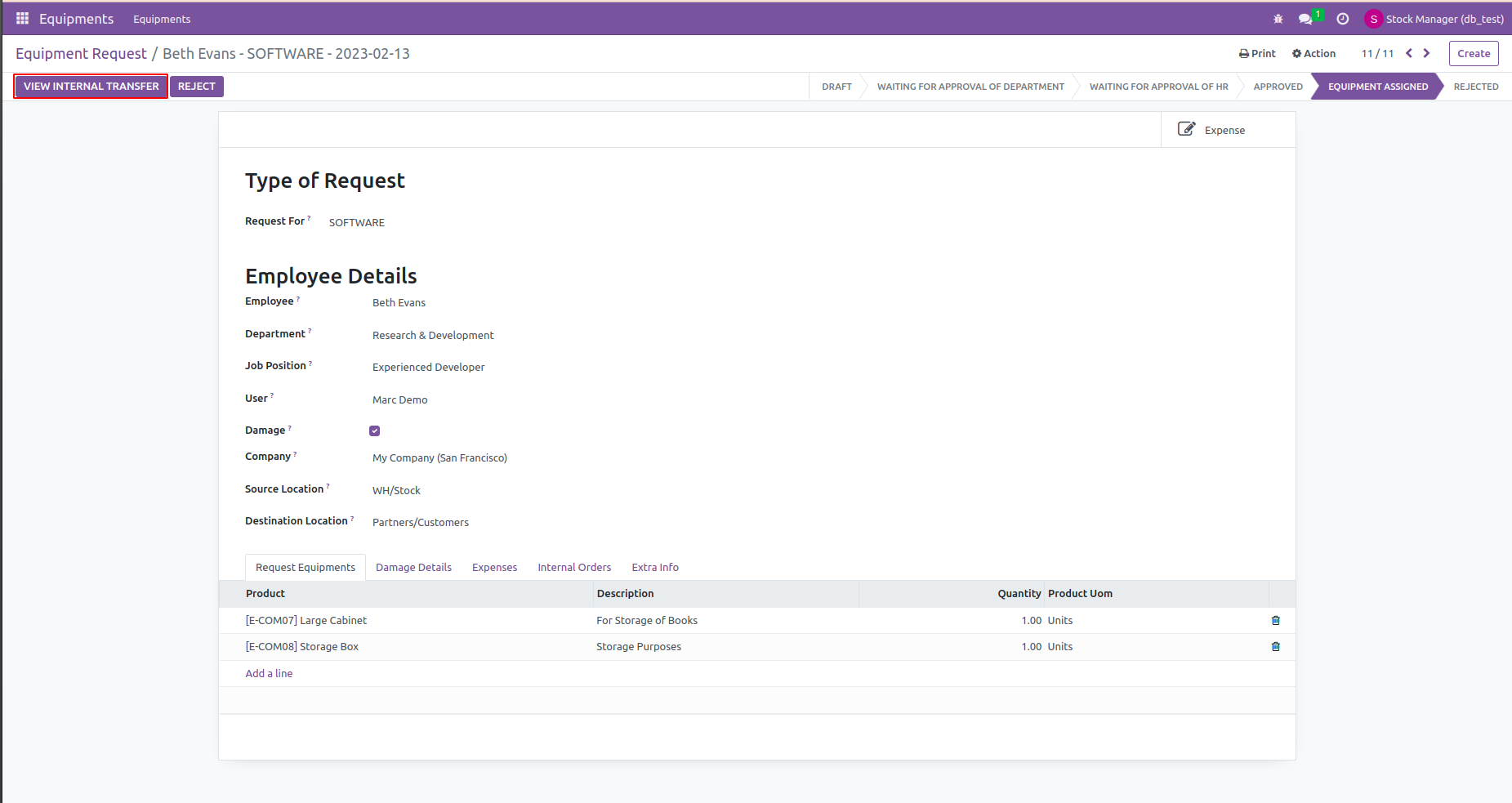 Stock Manager can create internal transfer for equipment requests to transfer requested equipment/product to employee location.