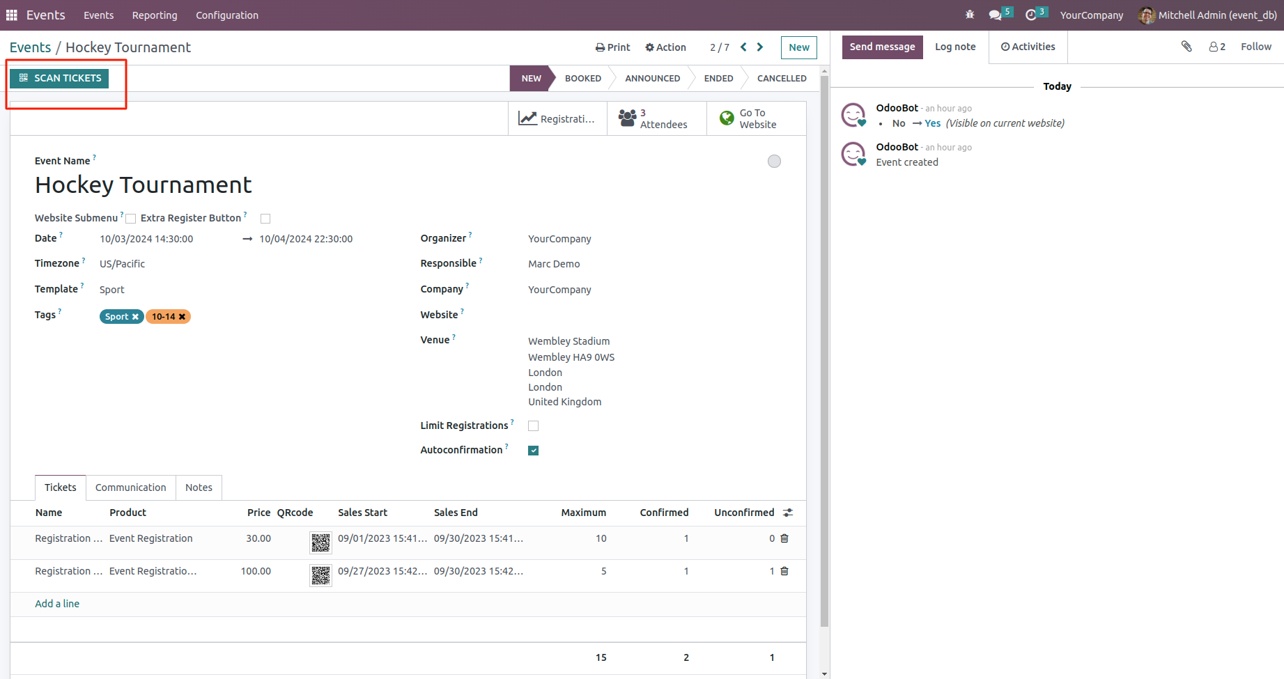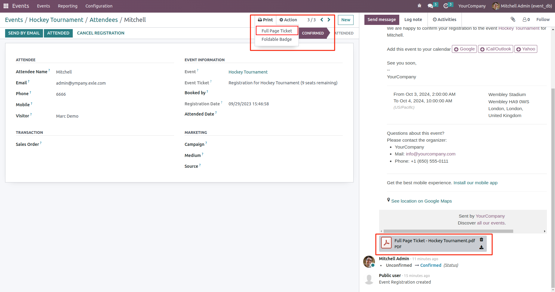 Sent Ticket contain QR code to Attendee by Mail on Confirming Registration for the Event.
