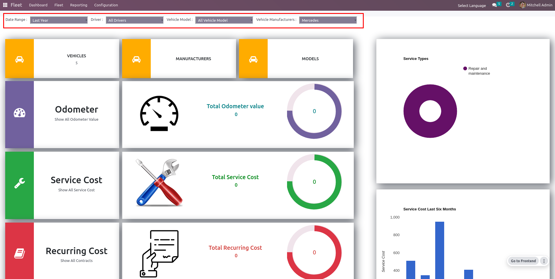 The Fleet Dashboard has different types of graphs that will give you a complete analysis of the Fleet Module.