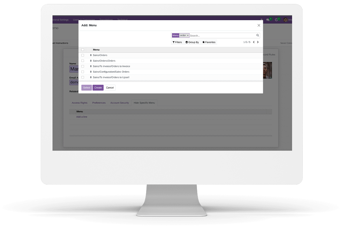 Click on 'Add a line' and select the menus that needs to be hidden for this user.