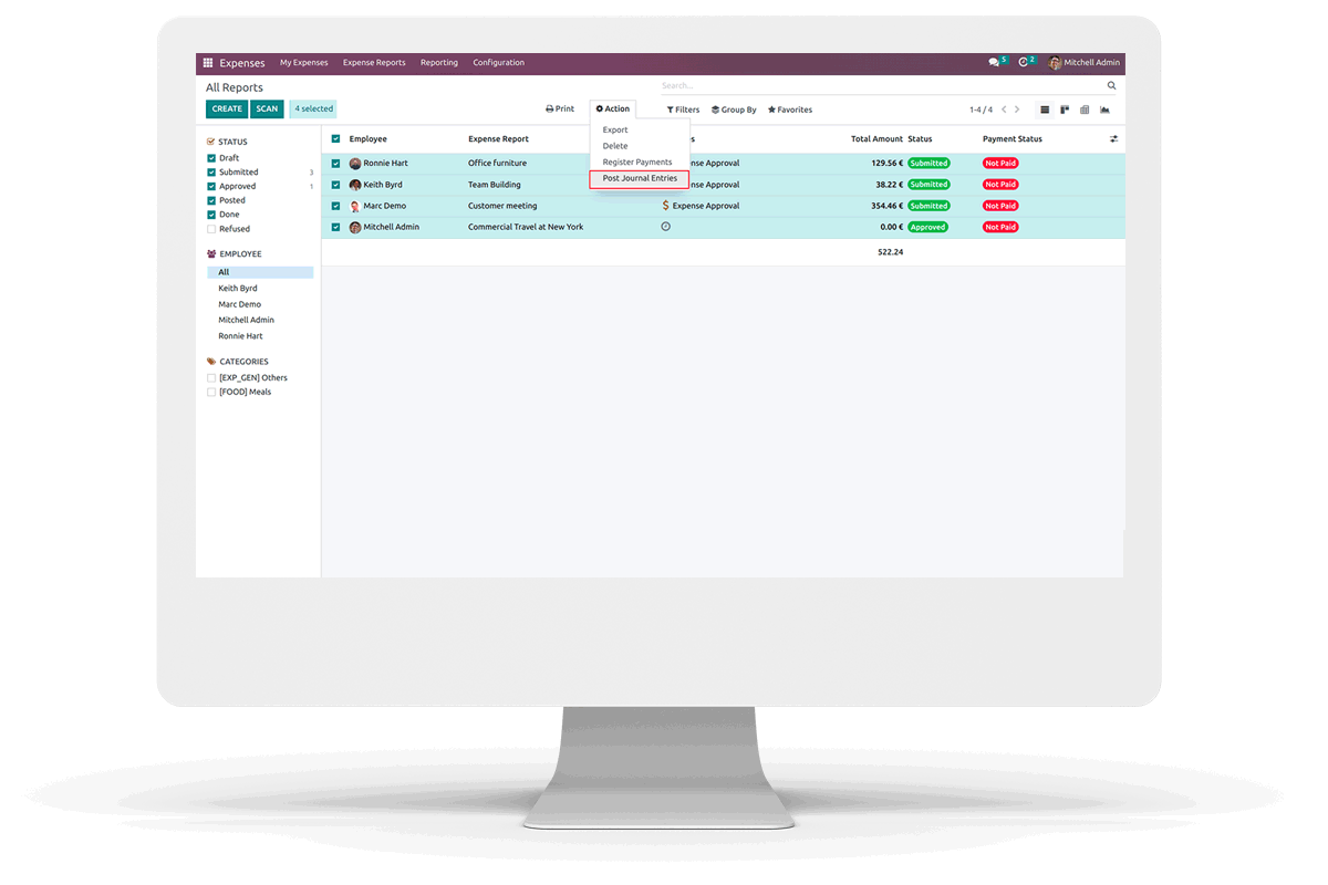 If the selected expense reports are in the approved state, clicking "Post Journal Entries" will change all the reports to the posted state.