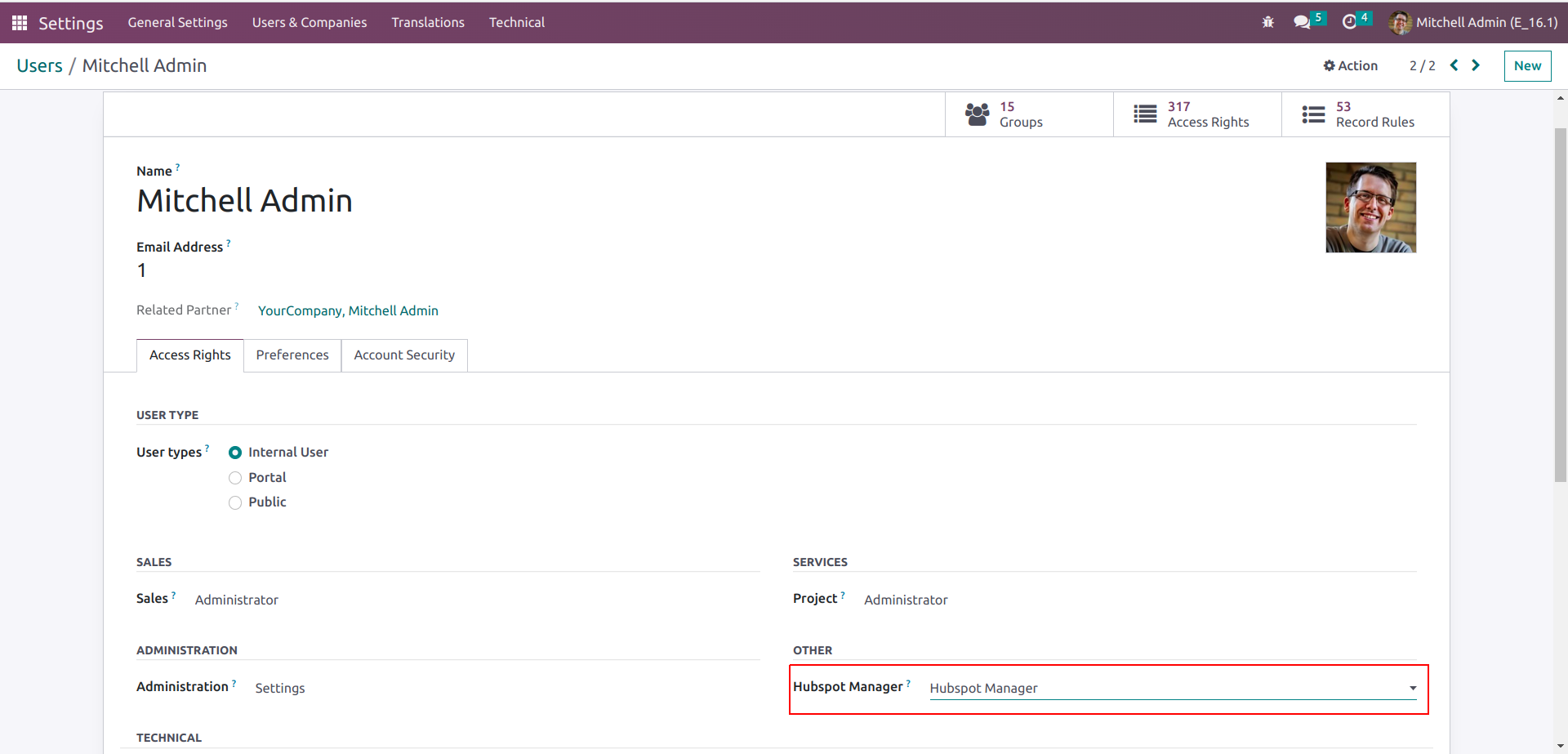 Go to Settings -> Users -> Select User -> Select Access Rights for 'HubSpot Manager'