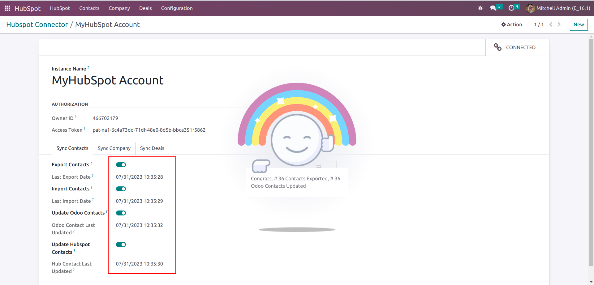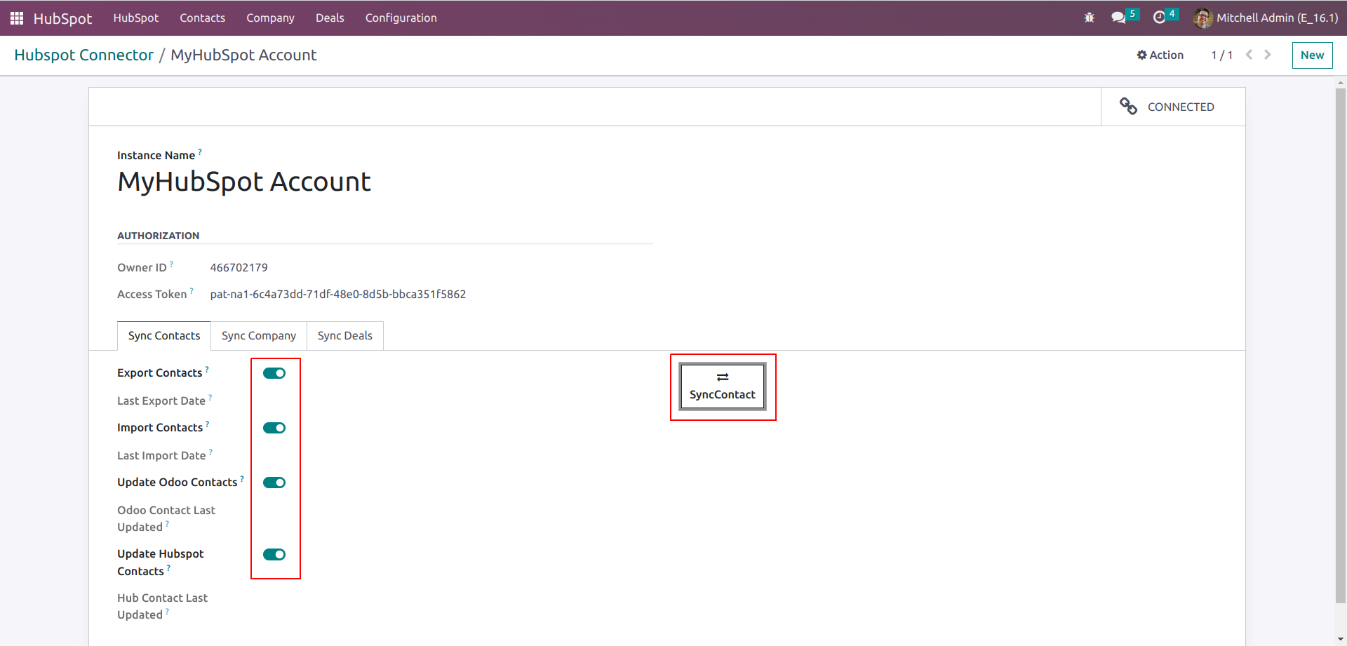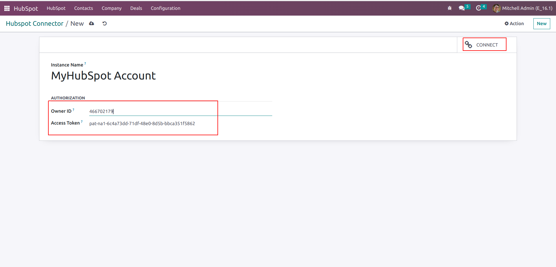 Provide the Name and Access Token and Owner ID of the Instance in Odoo
