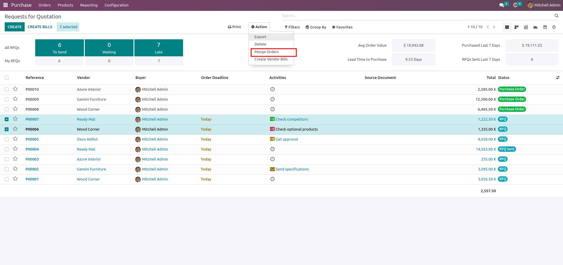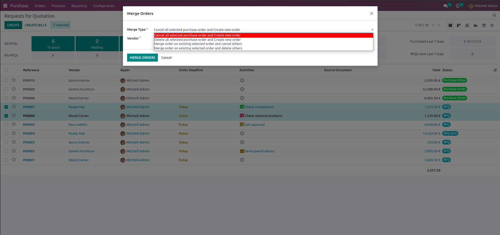 When select cancel all selected purchase order and create new order there is an option for selecting new vendor and click on button merge orders, it will cancel the all selected purchase order and create new order with the selected vendor and if select delete all selected purchase order and create new order, it will delete the all selected purchase order and create new order with the selected vendor.