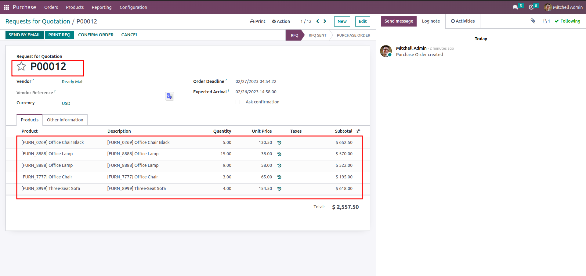 When select merge order on existing selected order and cancel others there is an option for selecting the RFQ and click on button merge orders, it will merge the order lines to the selected RFQ and cancel others and if select merge order on existing selected order and delete others, it will merge the order lines to the selected RFQ and delete others.