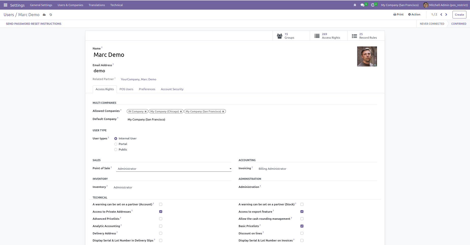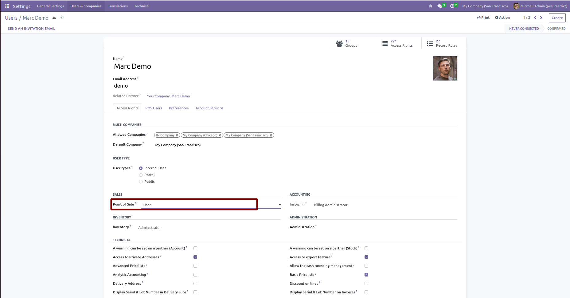 For setting access to each user, go to Settings --> Users and select point of sale user.