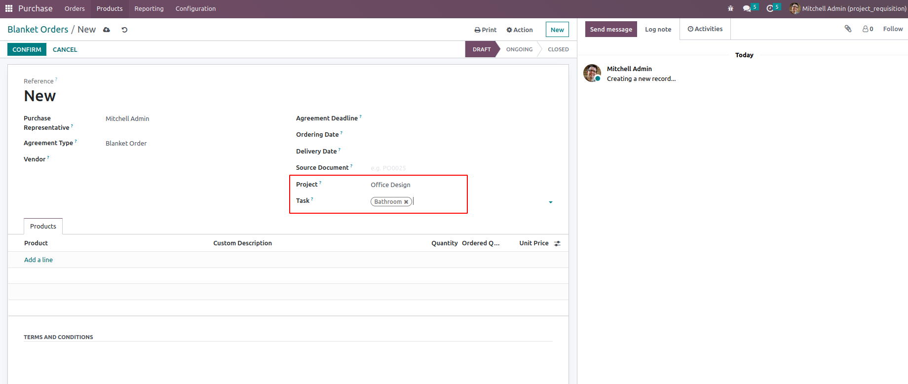 From the project form, by clicking the purchase tab, user can directly create new purchase agreement.