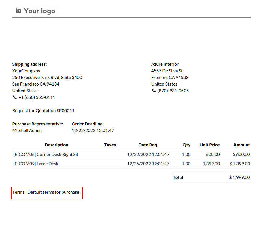 In the Purchase Terms App, We can configure the default purchase terms to our own need. There we can set default terms from the configuration settings of purchase module.