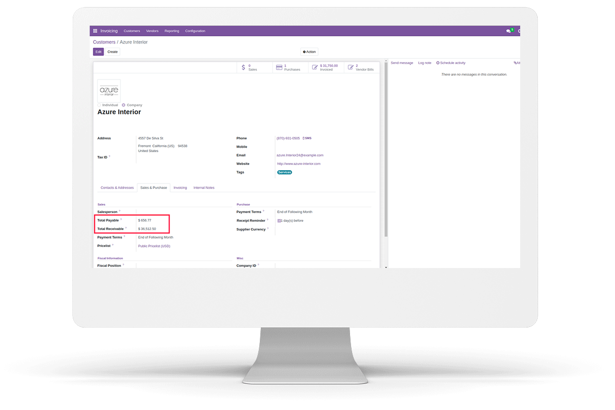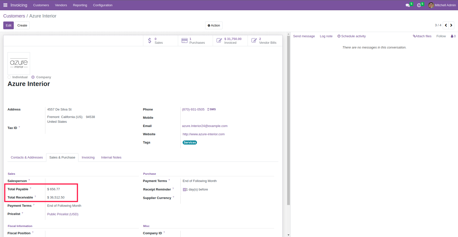 Screenshot of the partner form is shown below. The fields 'Total Payable' and 'Total Receivable' is inside the Sales & Purchase tab under the section Sales