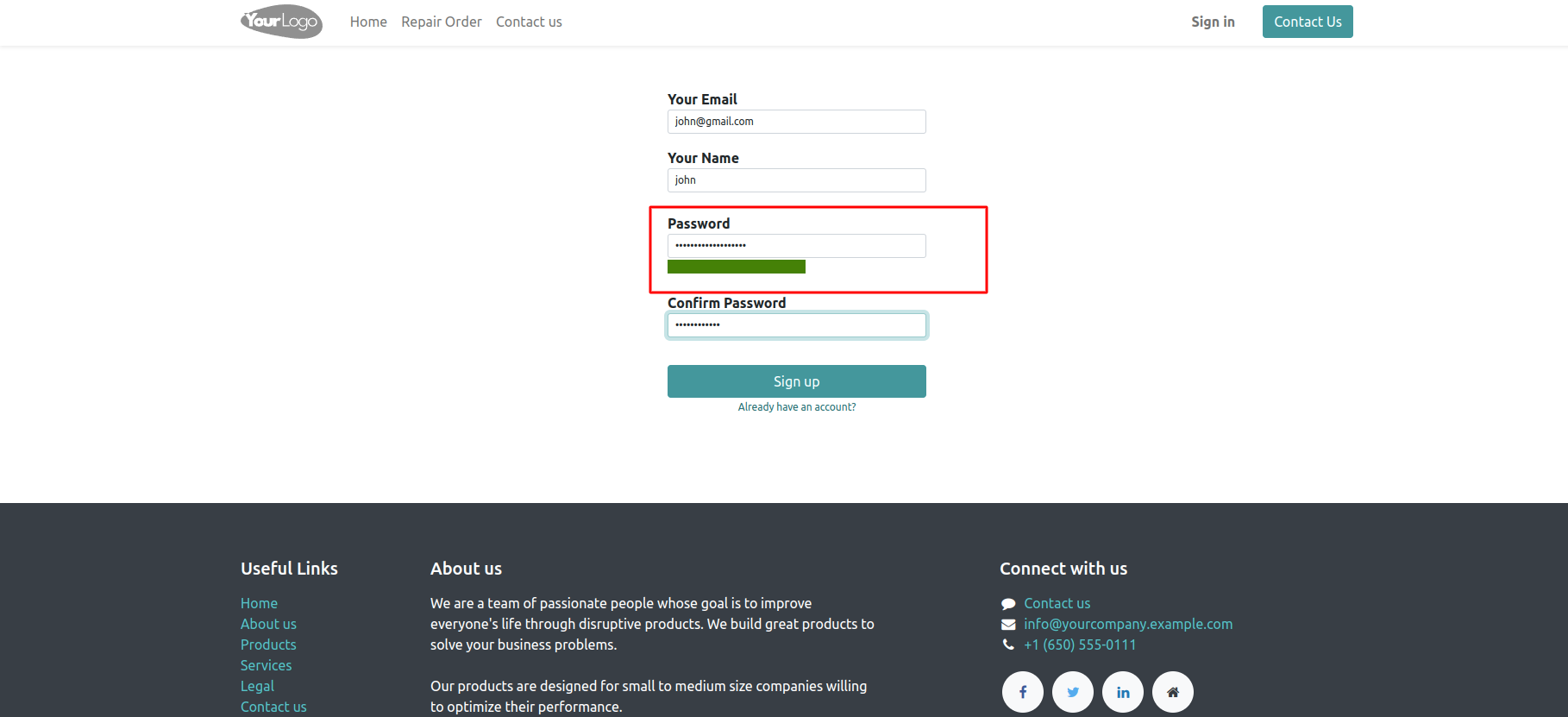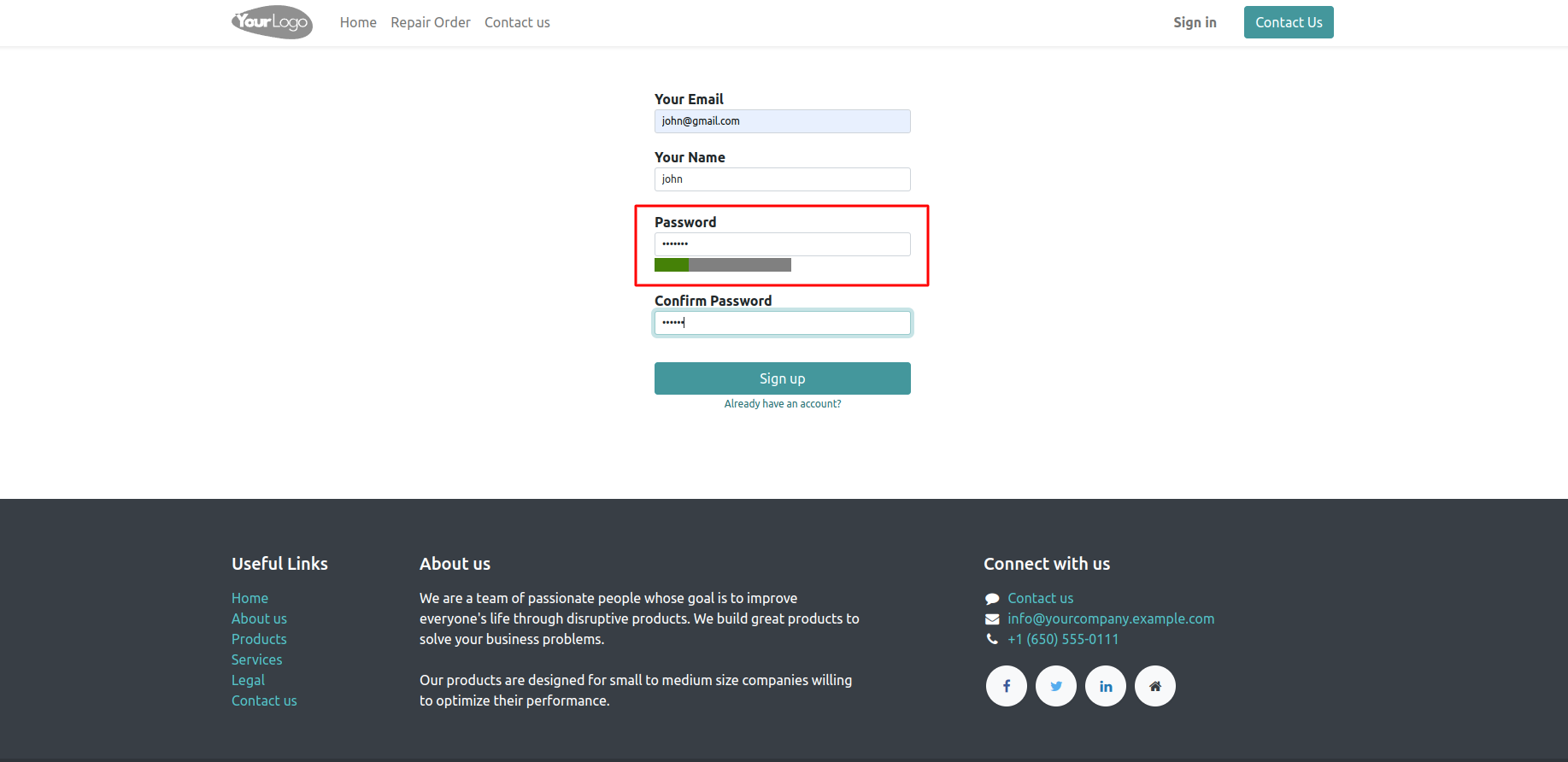 This module helps to show user password strength by checking if the password is a combination of alphanumeric characters along with special characters and shows percentage of the strength of the password and complexity of the password with the help of few conditions. Conditions for a strong password are: - Should have 8 characters. - Should have at least one number. - Should have at least one uppercase and one lowercase character. - Should have at least one special symbol.