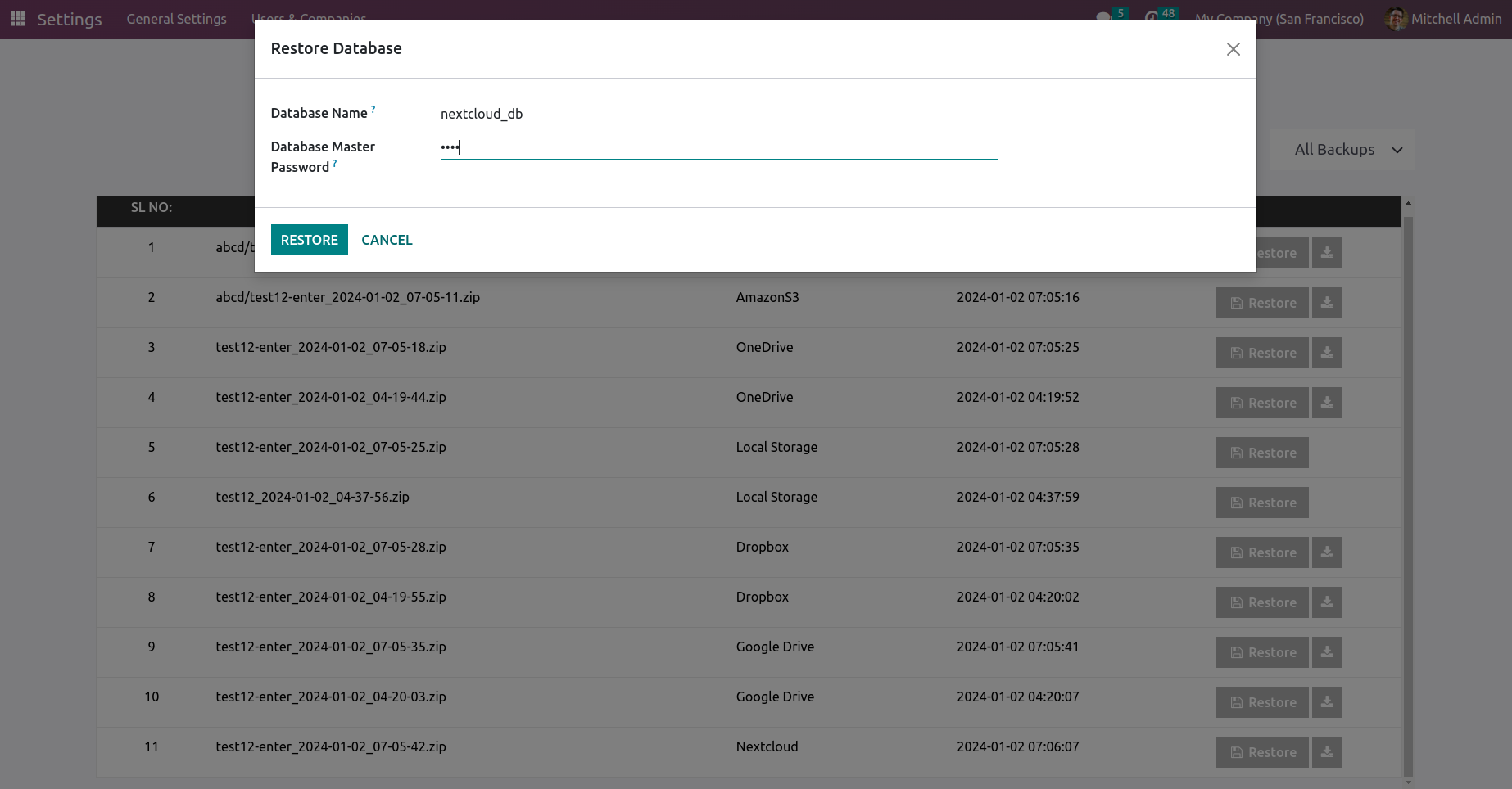 Easily Restore The Previous Database Backups Stored in Different Locations like Google Drive, Dropbox, Onedrive, Nextcloud and Amazon S3.