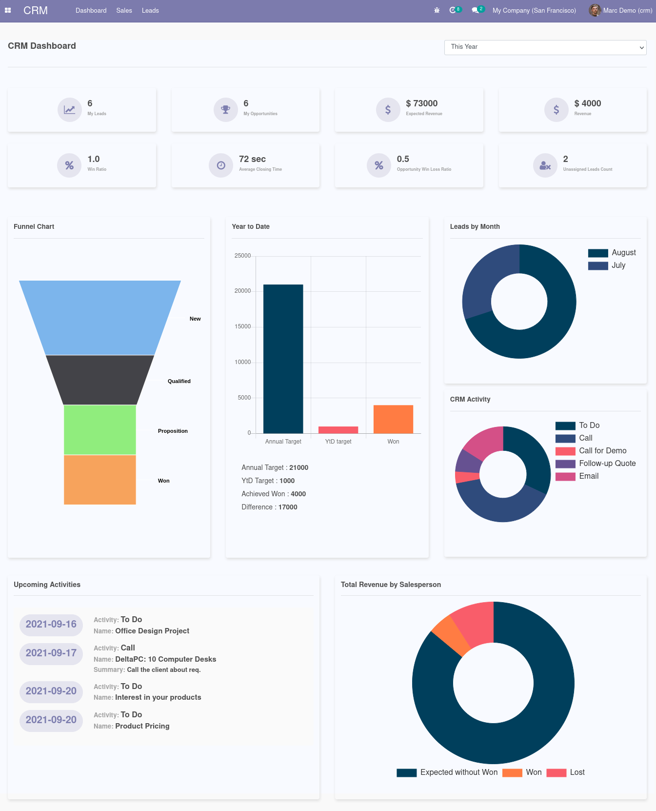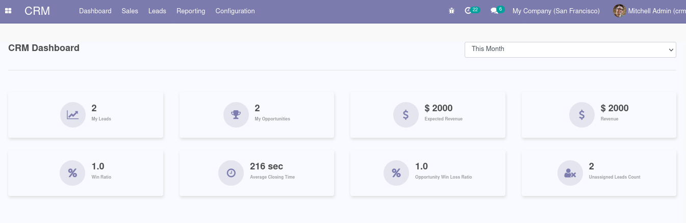 helps you to see the Overview of the CRM module. Here, you can view all details related to CRM