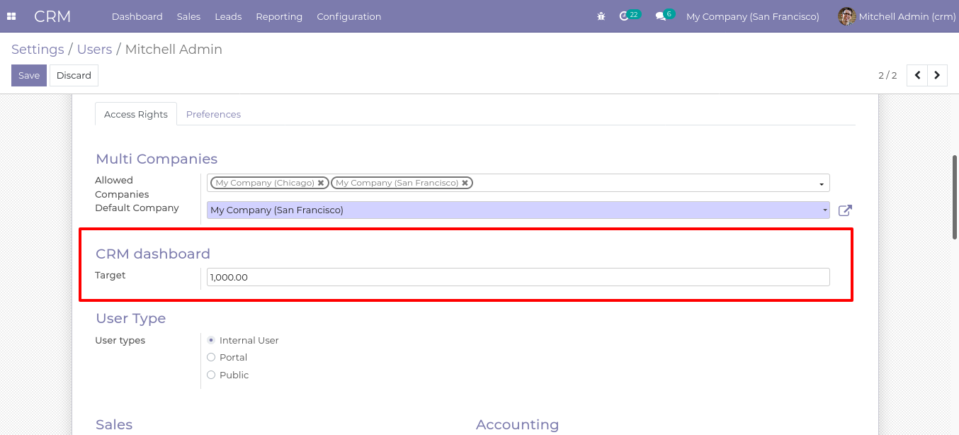 For each of the individual Salespersons, you will be able to set dedicated Targets using the CRM Kit. This will ensure that the Salesperson is motivated to keep with the business. The Targets can be set under the Settings tab > User Settings > Below the access right tab.