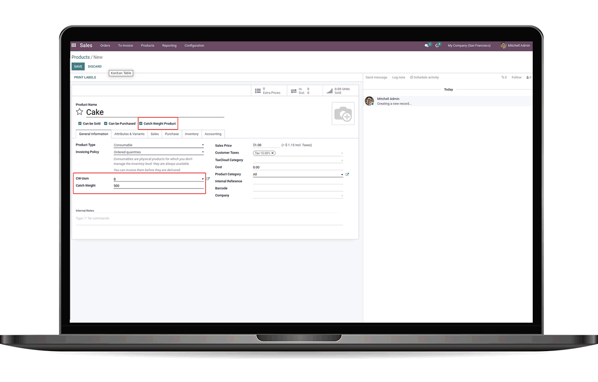 We can click on the checkbox "Catch Weight Product" to enable the Catch Weight of the product. Also add CW-Uom and the Catch Weight.