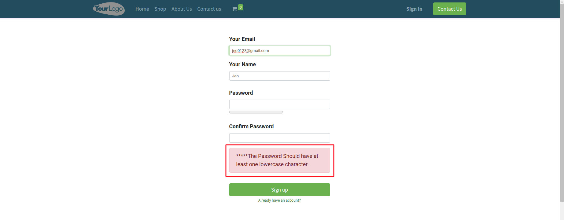 If selected conditions of the password is not satisfies the user password an error message will appear as warning about the conditions in signup form and restricting further signup.