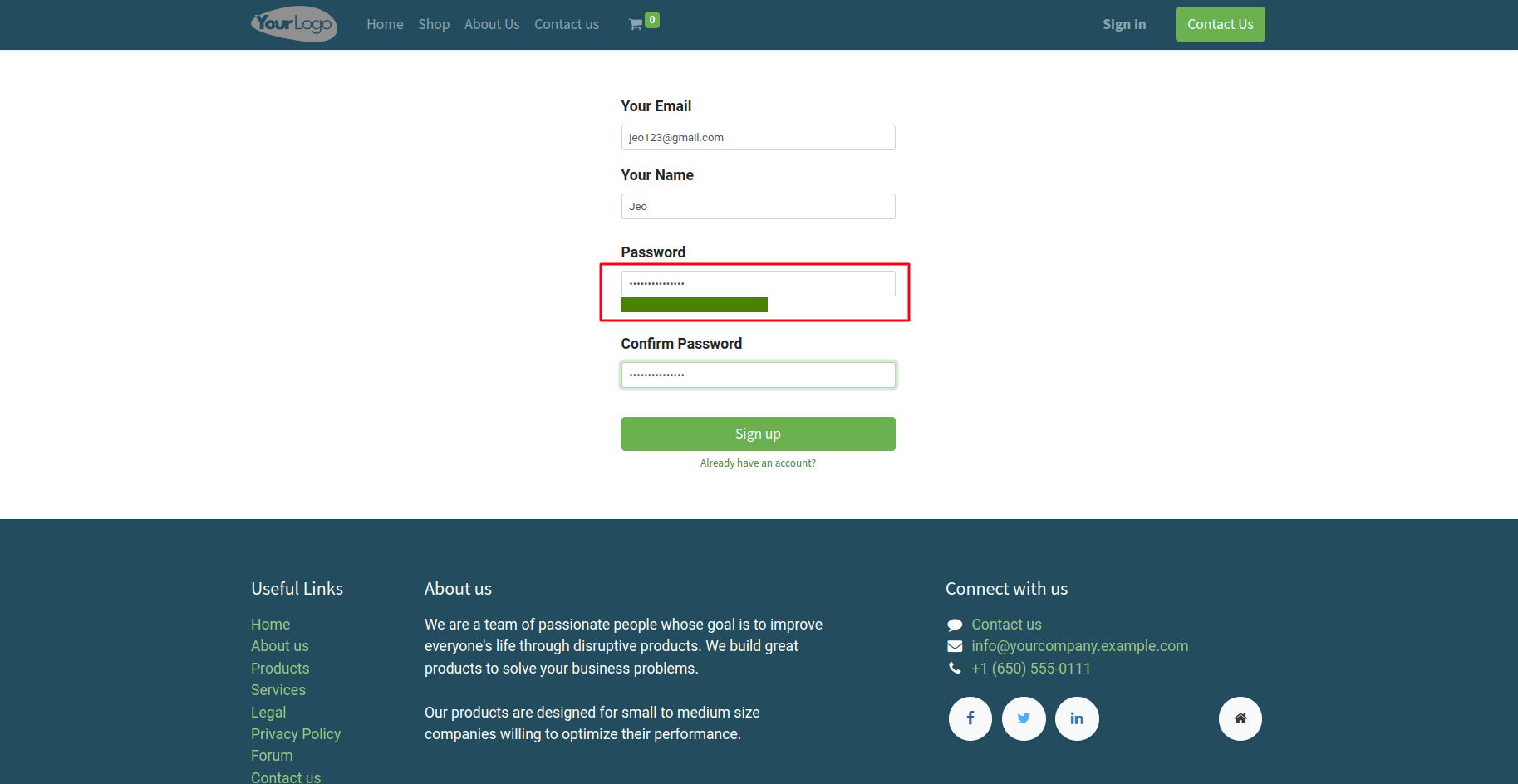 This module helps to show user password strength by checking if the password is a combination of alphanumeric characters along with special characters and shows percentage of the strength of the password and complexity of the password with the help of few conditions. Conditions for a strong password are: - Should have 8 characters. - Should have at least one number. - Should have at least one uppercase and one lowercase character. - Should have at least one special symbol.