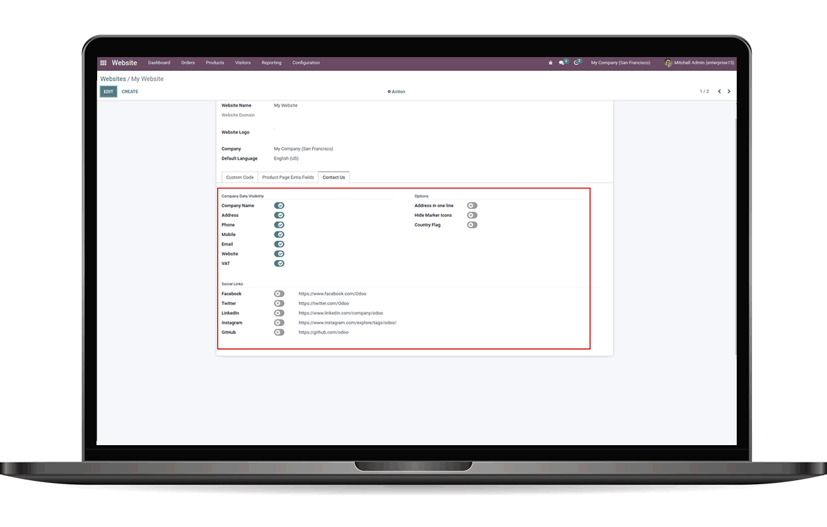 Website custom contact us module helps to manage the visibility of company details on the website Contact Us Page. By activating and deactivating the toggle buttons we can set the visibility of company details in the Website Contact Us Page.