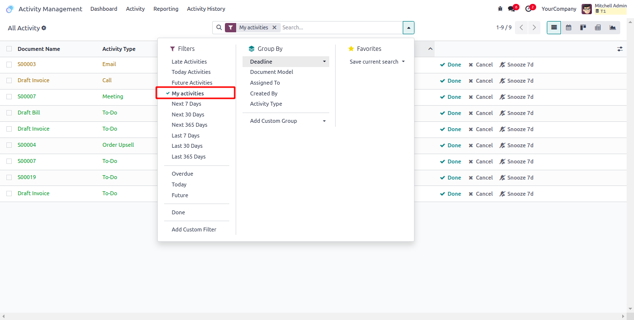 On clicking the button "Activities", a popup appears where we can create and schedule activities.