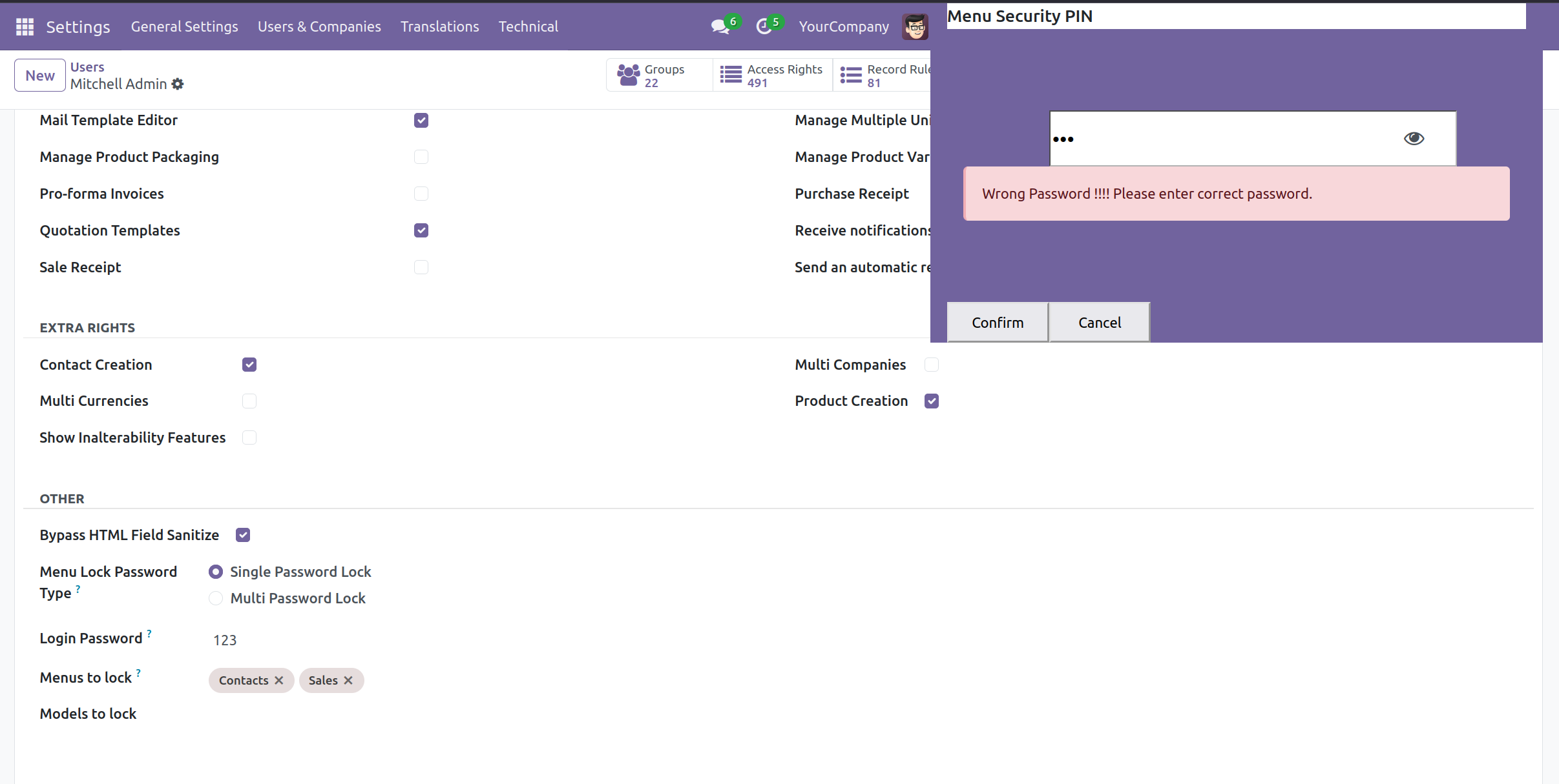 Go to Settings --> Users & Companies --> Users User can select the type of menu lock, single or multiple. Here we have selected 'Single Password Lock' and also added 'Menus to lock' and 'Login Password'.