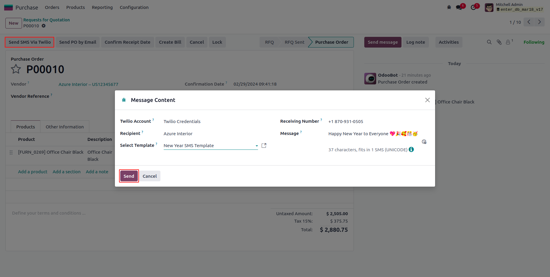 Create a Purchase Order and click Send SMS Via Twilio button to send the SMS from Purchase Order and Add the details then click Send button.