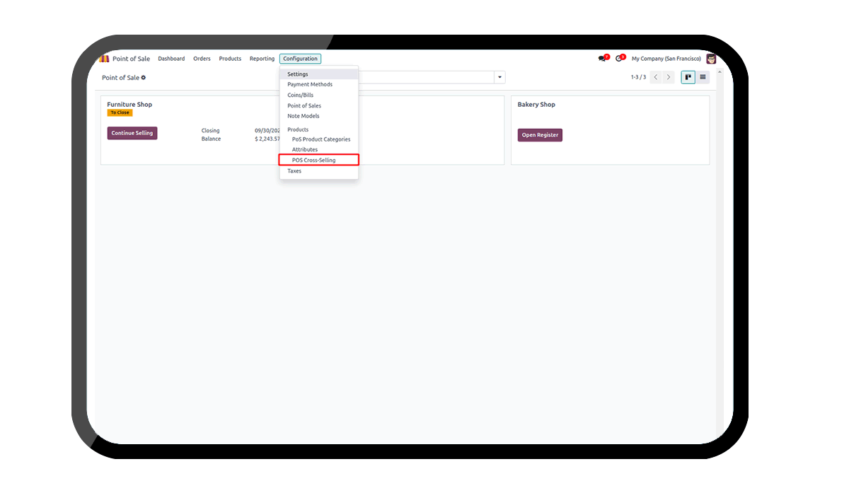 Navigate to Point of Sale → Configuration → POS Cross-Selling. From this menu, you can select and configure cross-selling products for different items.