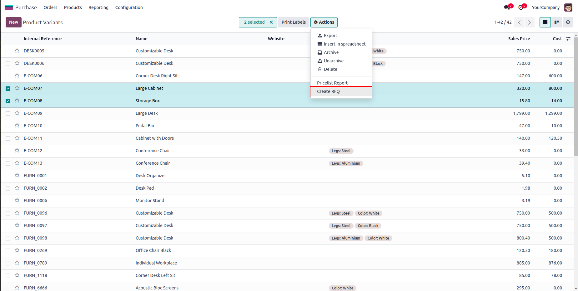 Added Create RFQ option inside Action button of Products Variants list.