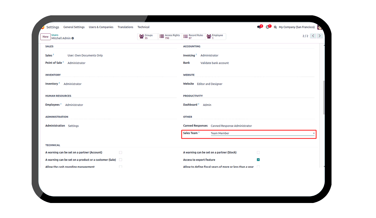 Select the Sales Team access right as Team Member and Sales access right as User: Own Documents Only.