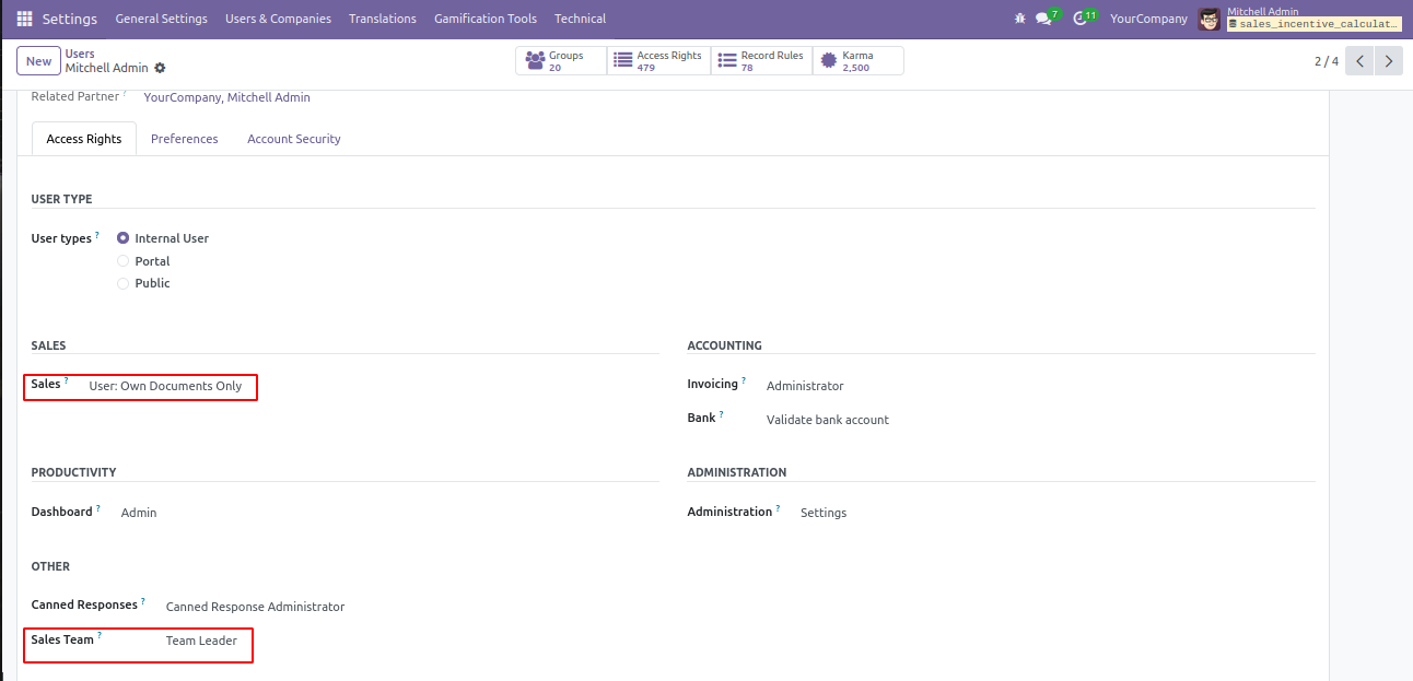 Select the Sales Team access right as Team Leader and Sales access right as User: Own Documents Only.