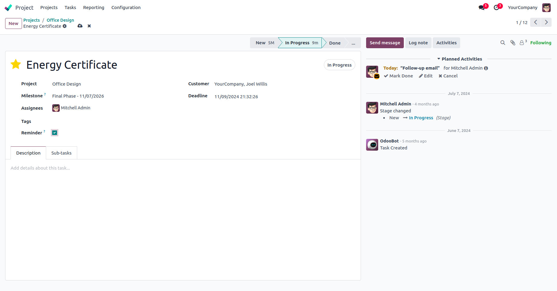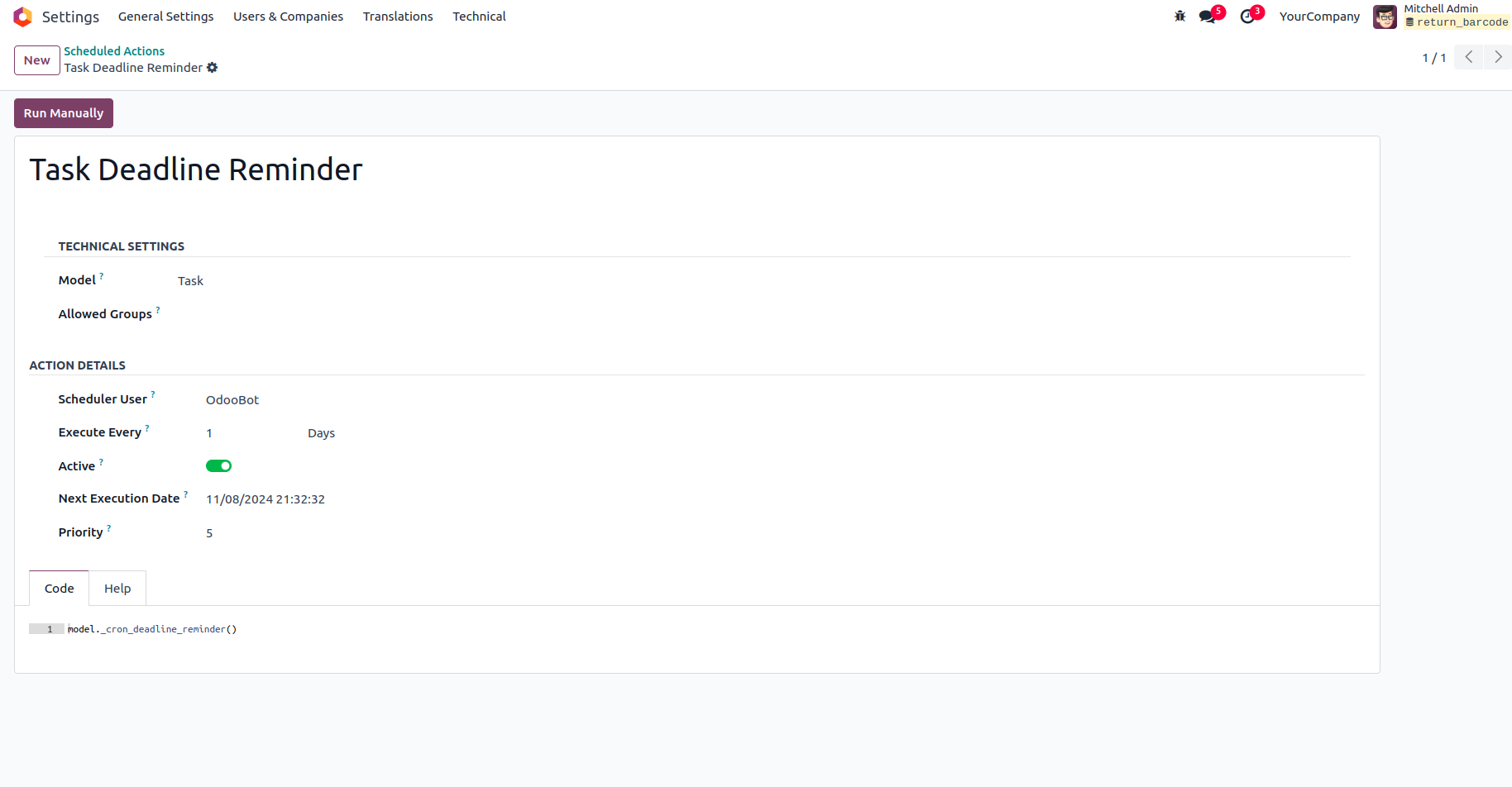 The Task Deadline Reminder module is an Odoo app that sends automatic reminder emails to users responsible for tasks on their due date. It helps users stay organized and avoid missing critical deadlines by notifying them through scheduled reminders.